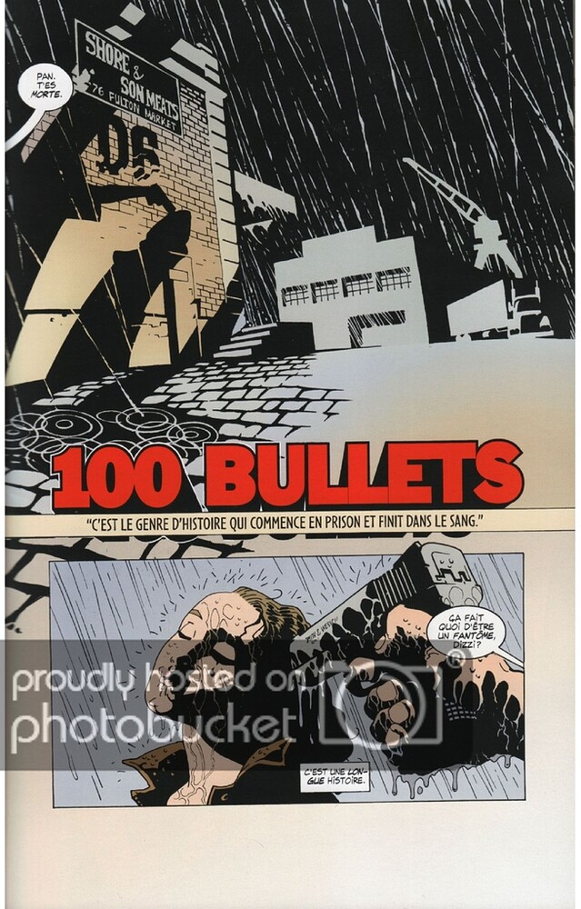Sinon quand je lis 100 Bullets, j’ai toujours une pensée pour les traducteurs : Sophie Viévard & Jérémy Manesse, typiquement le genre de traduction qui convoque une bonne connaissance de la langue d’origine 'normal !), mais aussi de l’argot (dans son acception la plus large) « américain », et une bonne connaissance de l’argot/verlan et autres idiomes djeune hexagonal.