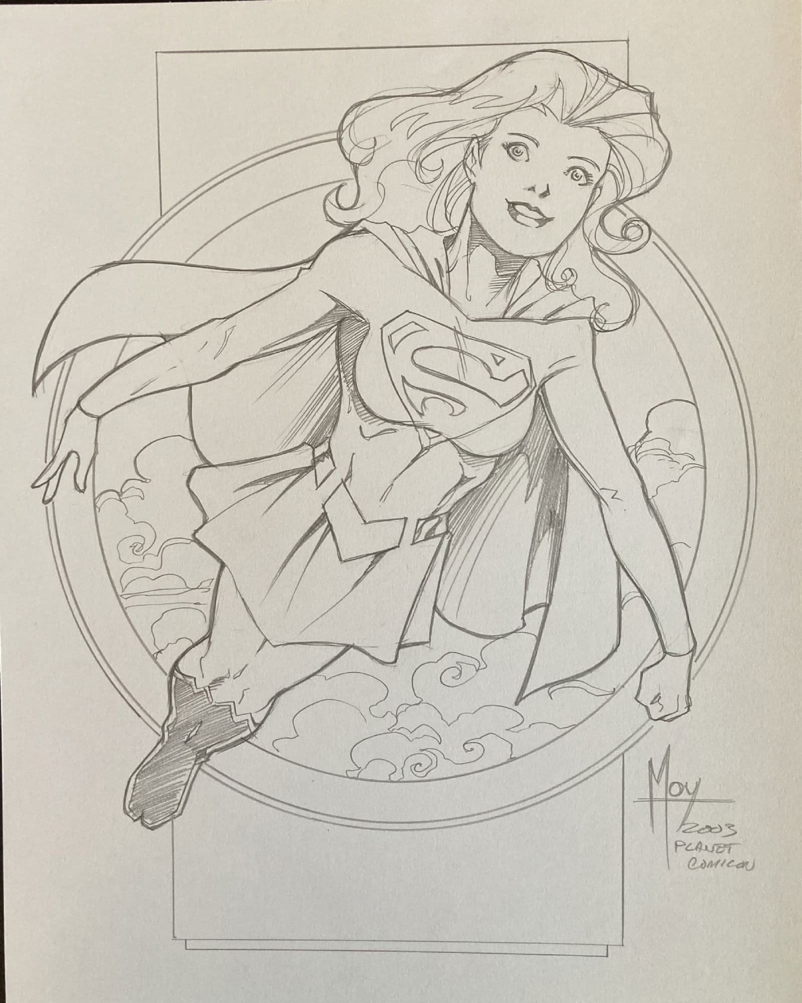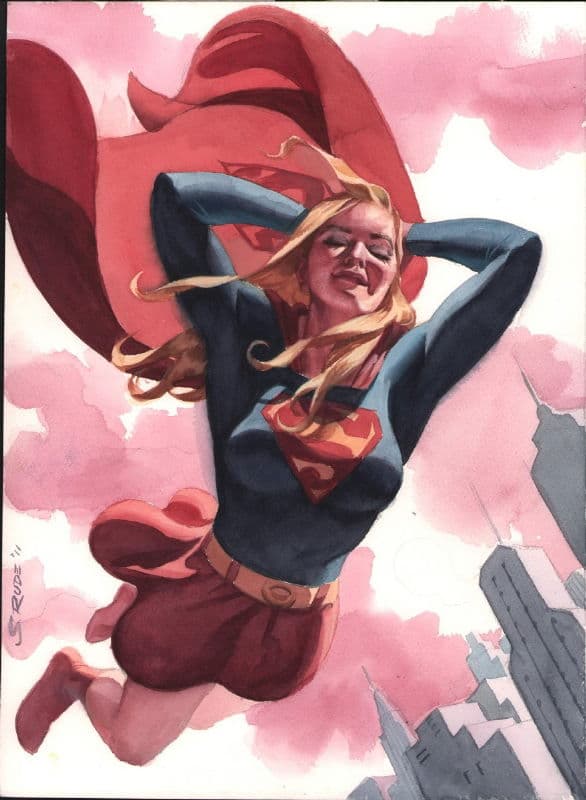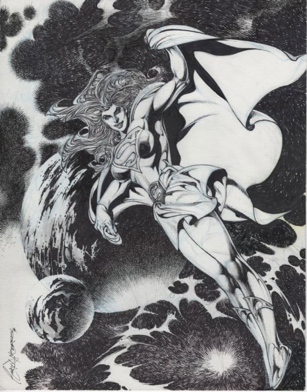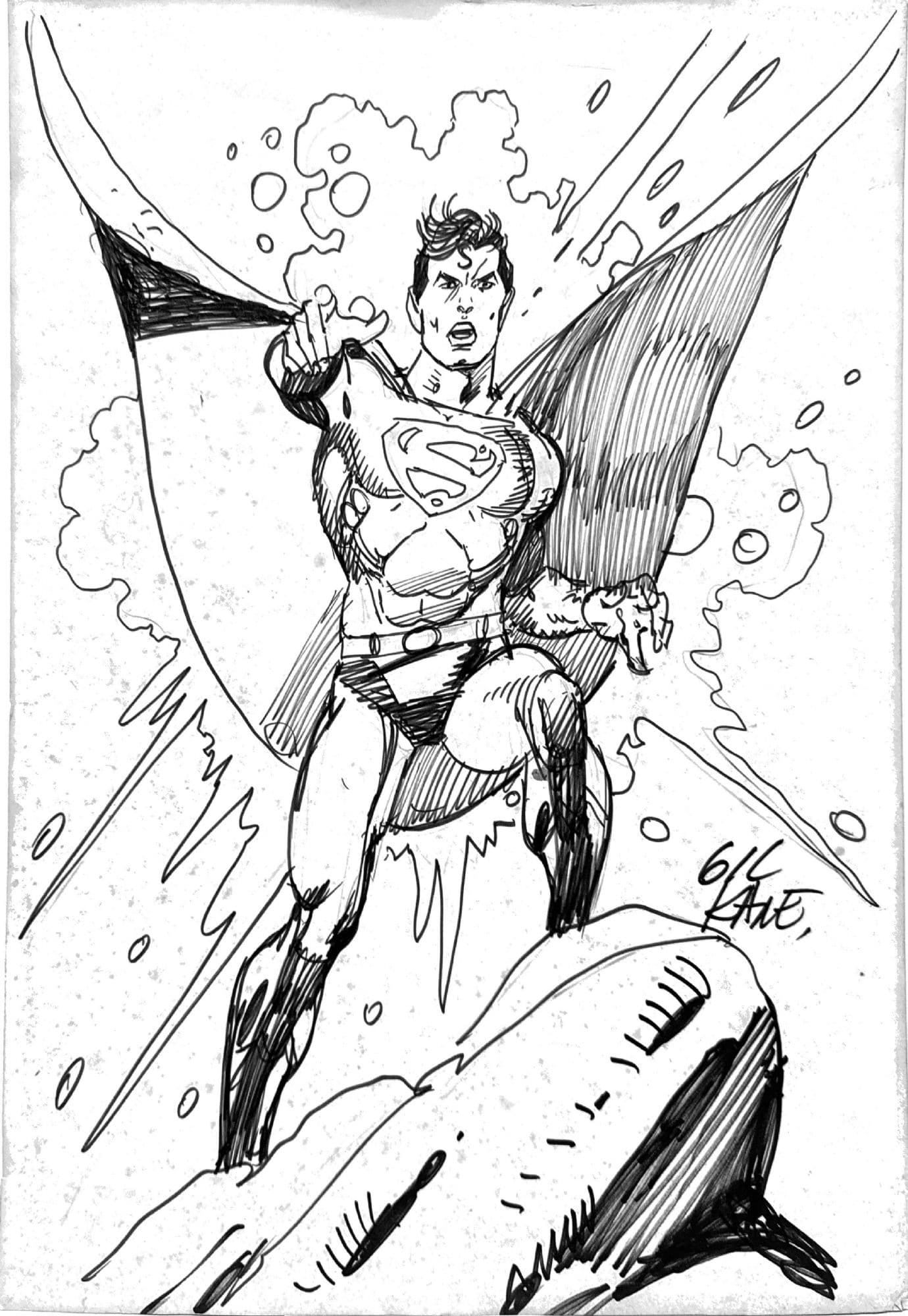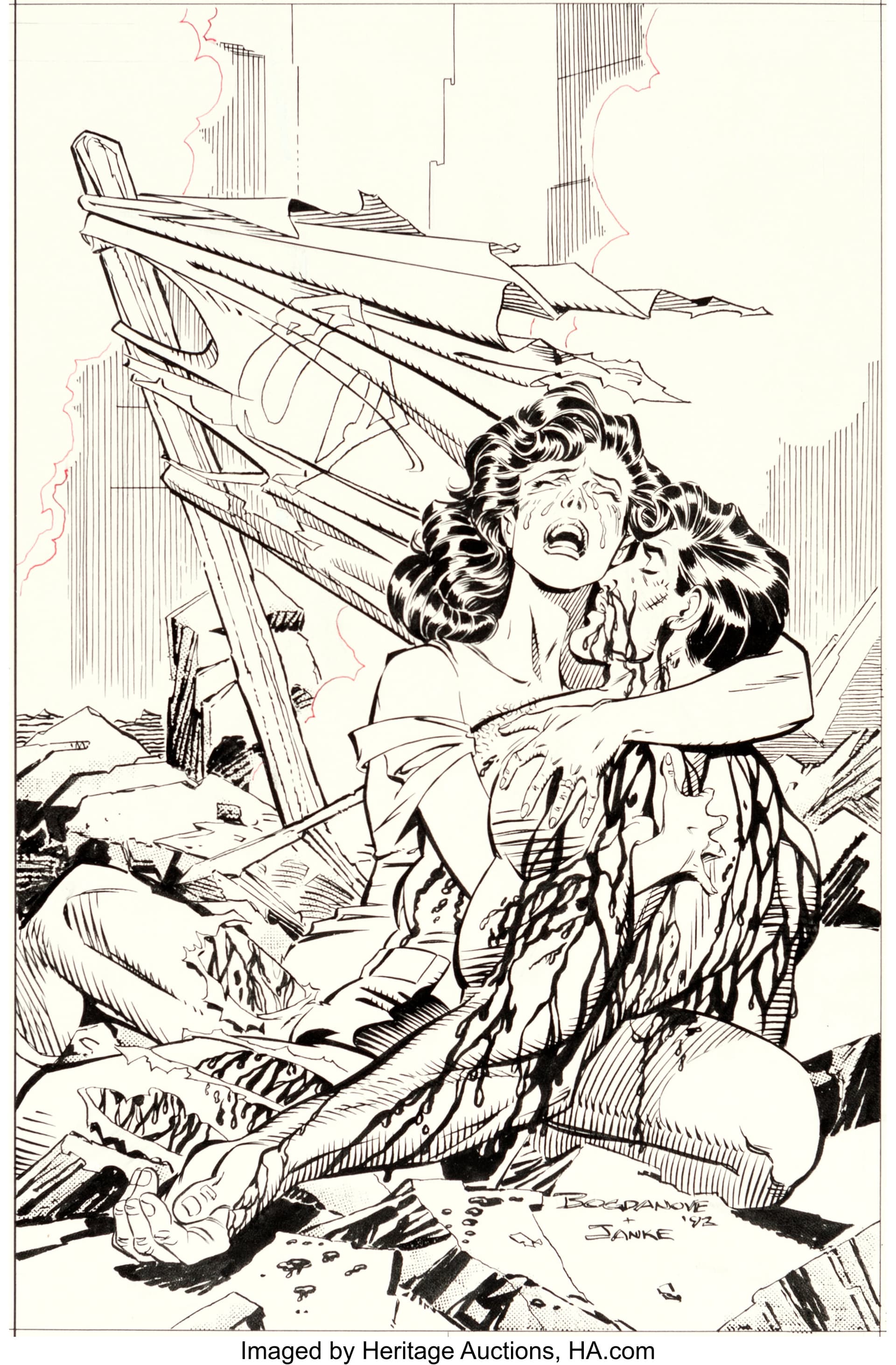 Jon Bogdanove and Dennis Janke The Death of Superman Trade Paperback Cover Original Art (DC, 1993). The « Death of Superman ! » There is no more memorable image from the Earth-shattering event than that of Lois cradling the lifeless body of the world’s greatest hero – and the love of her life – with his tattered cape bearing the iconic symbol of the Man of Steel in the background, after facing Doomsday, the Kryptonian killing machine. When DC revealed that they planned to kill Superman, word spread worldwide and the event fostered unprecedented news coverage, causing Superman #75 to be the top selling book of 1992. This cover was created for the collected edition, which is one of the bestselling trade paperbacks of all time! Ink and dot half-tone over graphite on DC cover stock Bristol board with an image area of 9.75" x 15". Red key lines for additional effects, with light creasing to the board. Signed by the art team in the lower image area. In Excellent condition.