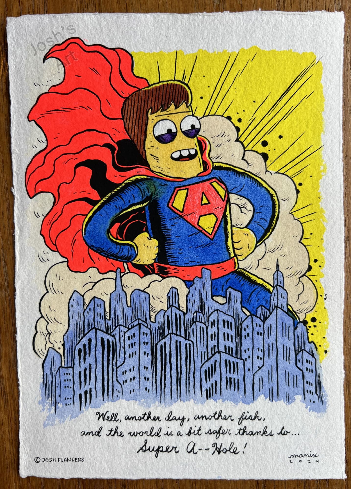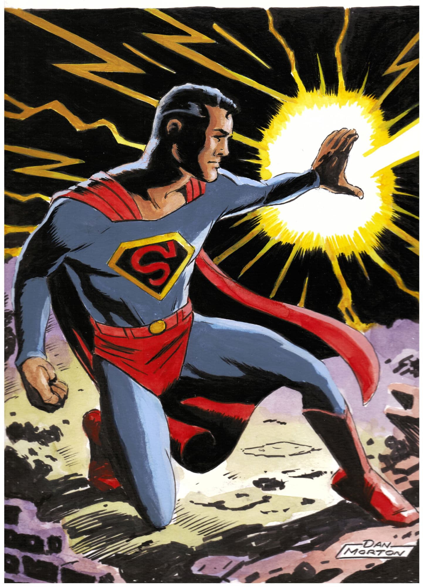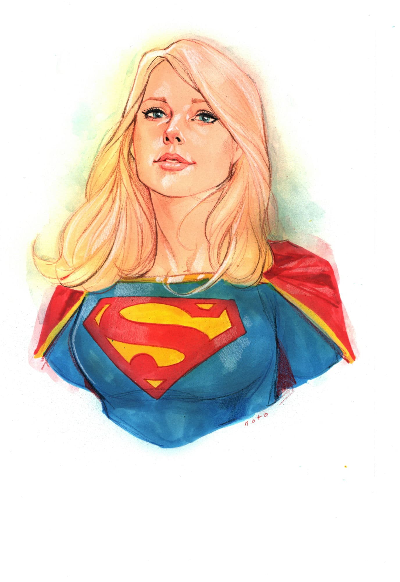 Jon Bogdanove and Dennis Janke The Death of Superman Trade Paperback Cover Original Art (DC, 1993). The « Death of Superman ! » There is no more memorable image from the Earth-shattering event than that of Lois cradling the lifeless body of the world’s greatest hero – and the love of her life – with his tattered cape bearing the iconic symbol of the Man of Steel in the background, after facing Doomsday, the Kryptonian killing machine. When DC revealed that they planned to kill Superman, word spread worldwide and the event fostered unprecedented news coverage, causing Superman #75 to be the top selling book of 1992. This cover was created for the collected edition, which is one of the bestselling trade paperbacks of all time! Ink and dot half-tone over graphite on DC cover stock Bristol board with an image area of 9.75" x 15". Red key lines for additional effects, with light creasing to the board. Signed by the art team in the lower image area. In Excellent condition.