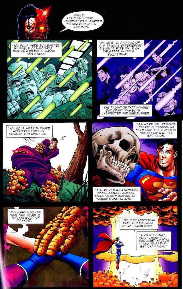 Ce que Jurgens aura à nouveau l’occasion de mettre en exergue (Cyborg Superman/Henshaw constate lui-même ces points communs) lors de la rencontre entre Superman & les FF (1999).