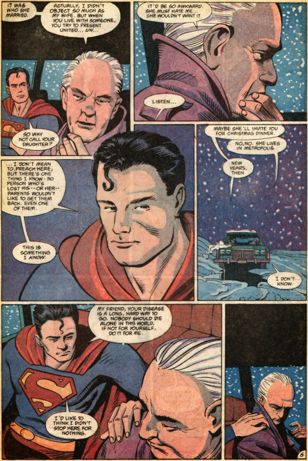 Le Boy Scout utilise ses pouvoirs pour réchauffer (littéralement) l’atmosphère et réparer la batterie du véhicule, puis s’occupe de remonter un peu le moral de l’homme, le convainc notamment d’essayer de renouer avec sa fille — et, en attendant mieux, lui confie avant de s’éclipser l’adresse d’un certain vieux couple habitant non loin de là dans la bourgade de Smallville, qui seront sûrement prêt à l’accueillir pour qu’il ne passe pas un Noël tout seul.