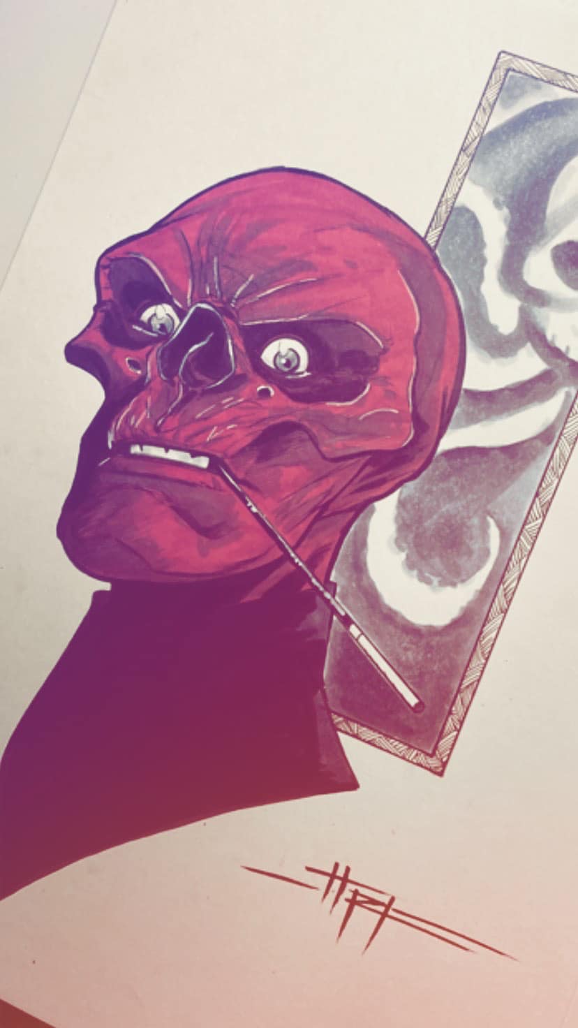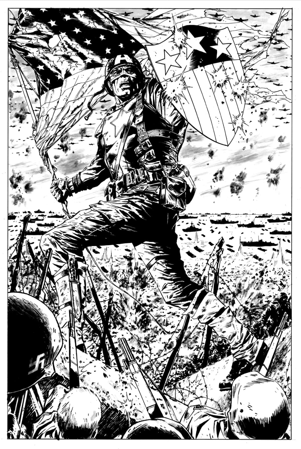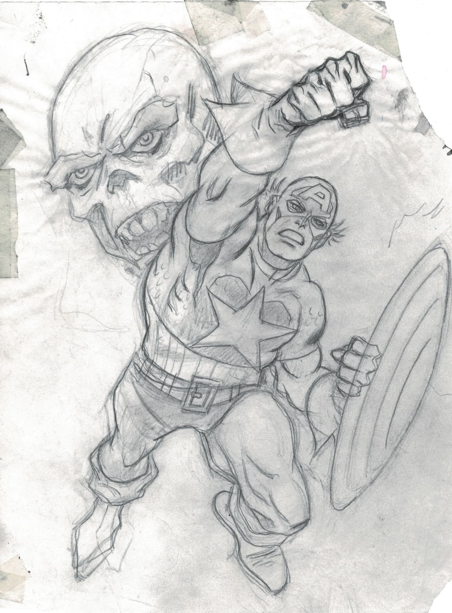 Should’ve shrunken the Red Skull’s head a bit, but what the heck. Normally I’d have shown the MP40 firing from the left (as cause should always precede effect in comics storytelling), but I thought Cap’s charge was more important to highlight going L to R. (Your Mileage May Vary on this point.)"