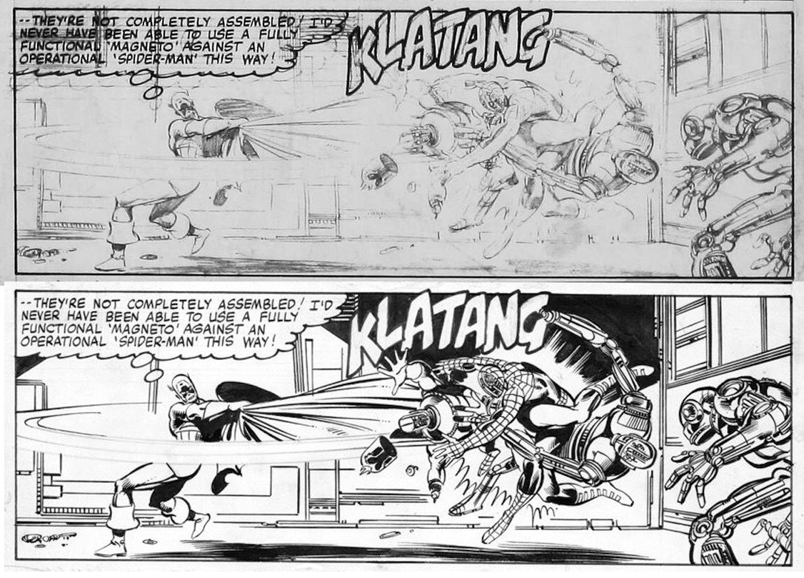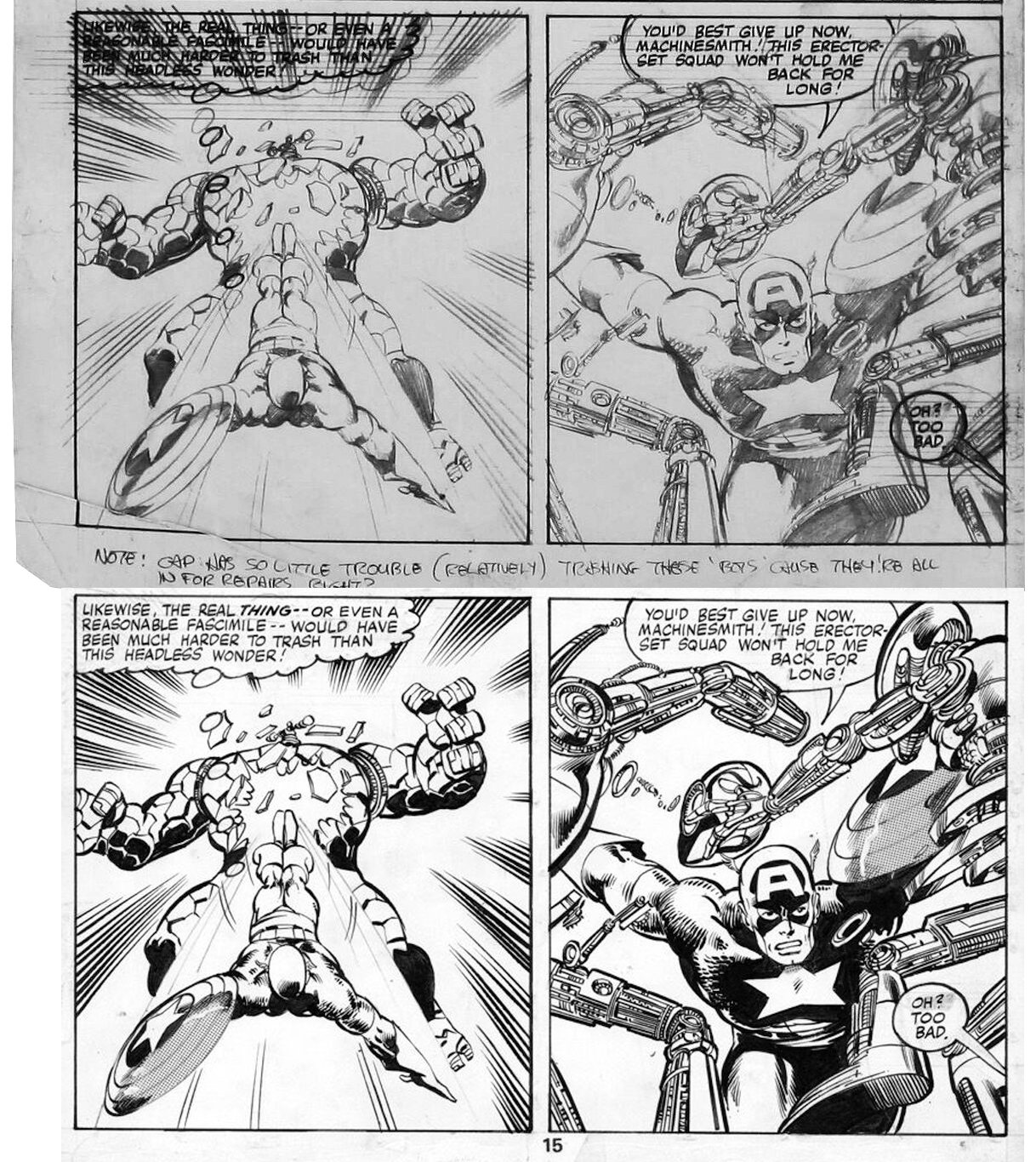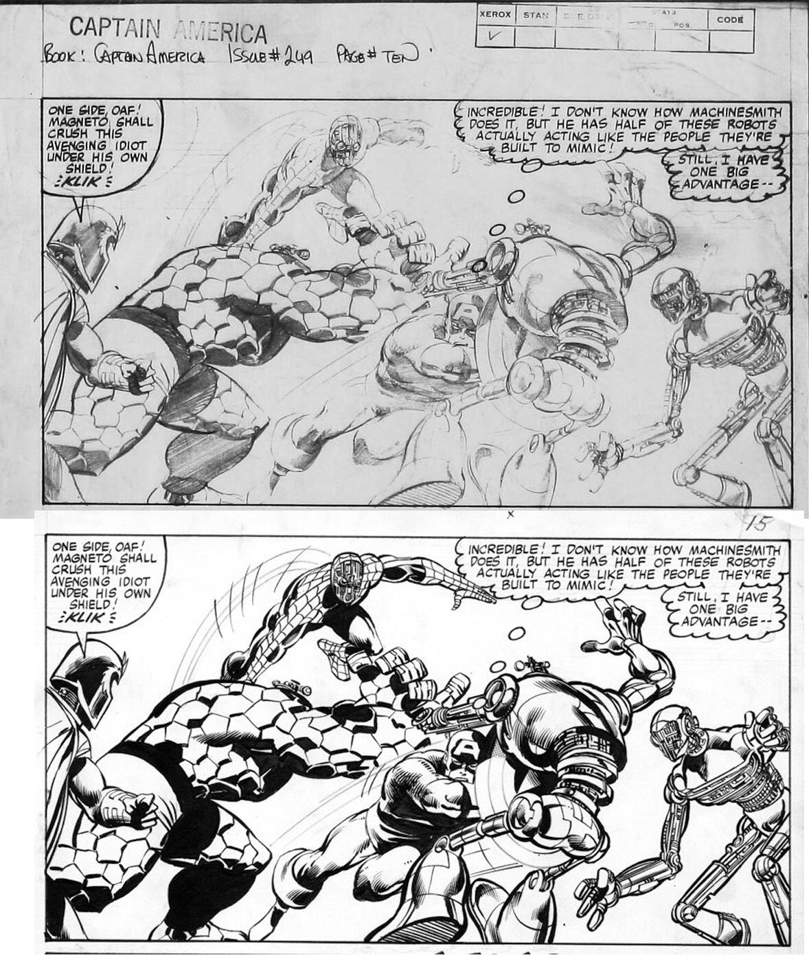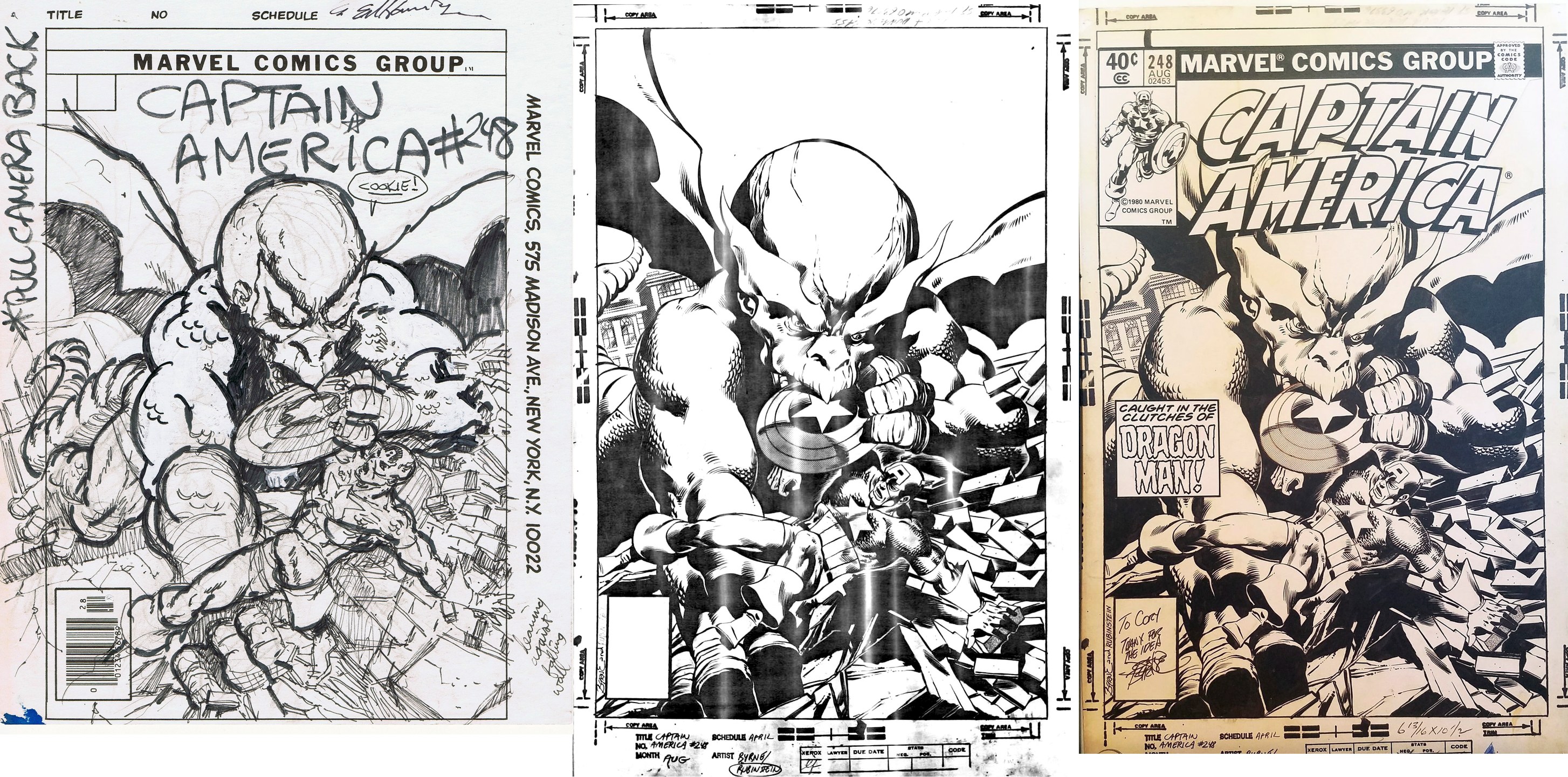 Comparison between Hannigan’s layout (left), a xerox of the art without the trading dress (middle) and the original art. What’s odd is the note inside of the barcode box, where Byrne thanks Cory (likely Vandernet) for the idea, when he worked from a layout supplied by Hannigan. Maybe he refers to another idea…