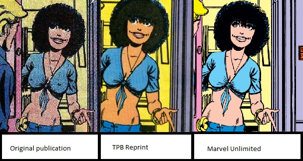 Comparison: The same panel from the original publication, TPB and Marvel Unlimited editions to show artwork alterations after the fact.