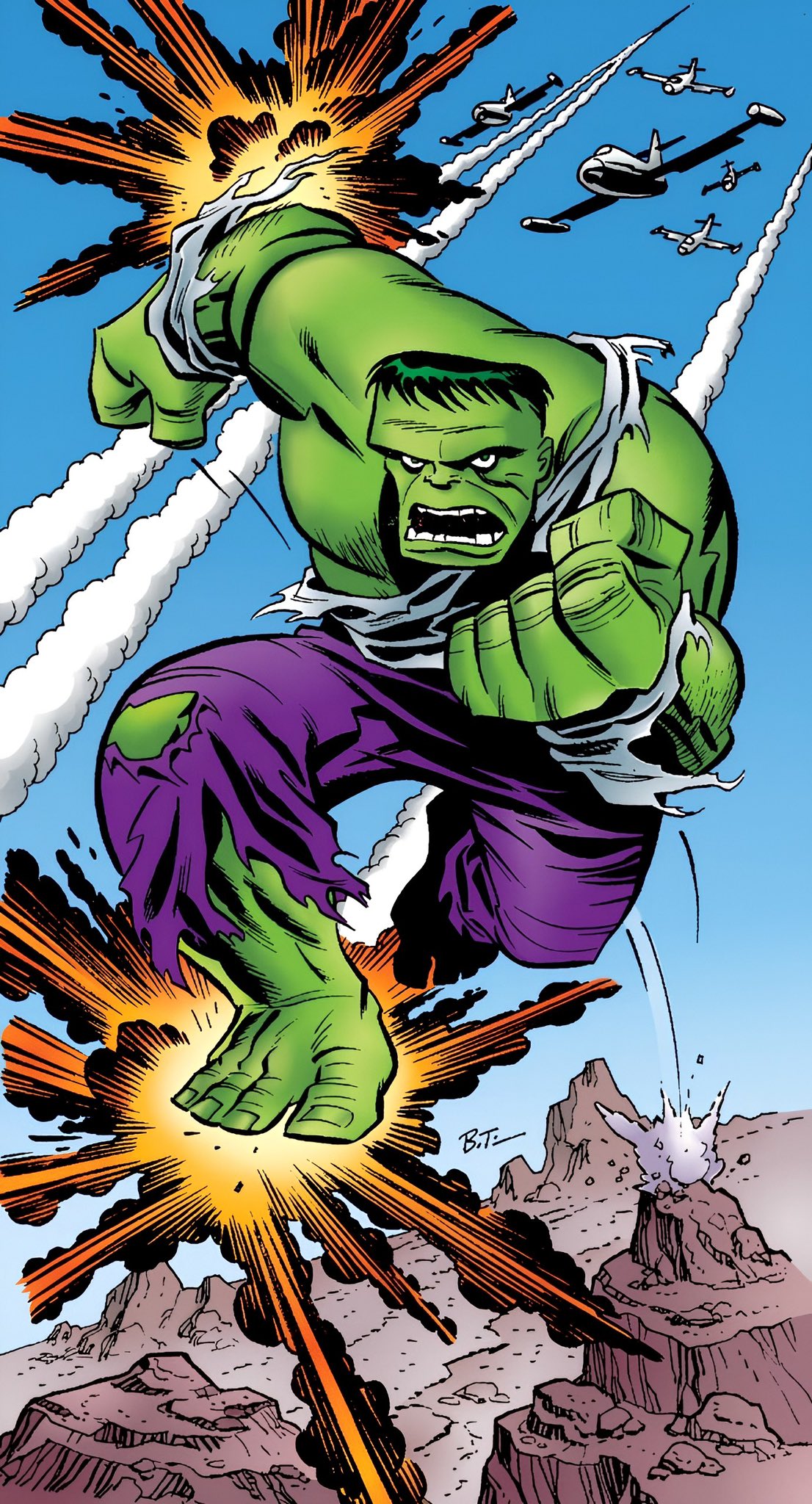 The Incredible Hulk #214 (August 1977). I always thought this splash captured the Hulk’s weight and power, hitting the ground so hard he sent anything not bolted down leaping into the air. Inks by Ernie Chan.