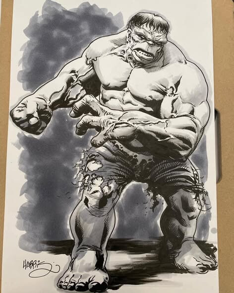 In terms of blacks and whites, I kept the lighting very directional, carving the muscles with hard shadows and letting large black shapes define the form. The deep blacks in the arms and torso anchor the figure, while the lighter background keeps him readable even with all the chaos. The textures are controlled. There’s hatching, but it’s secondary. Most of the weight comes from solid shapes and contrast, not from decoration.
