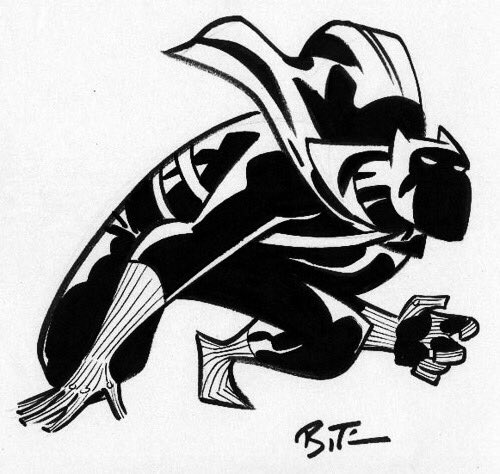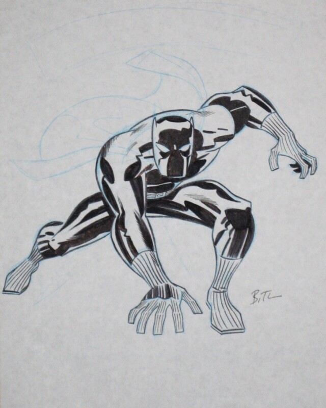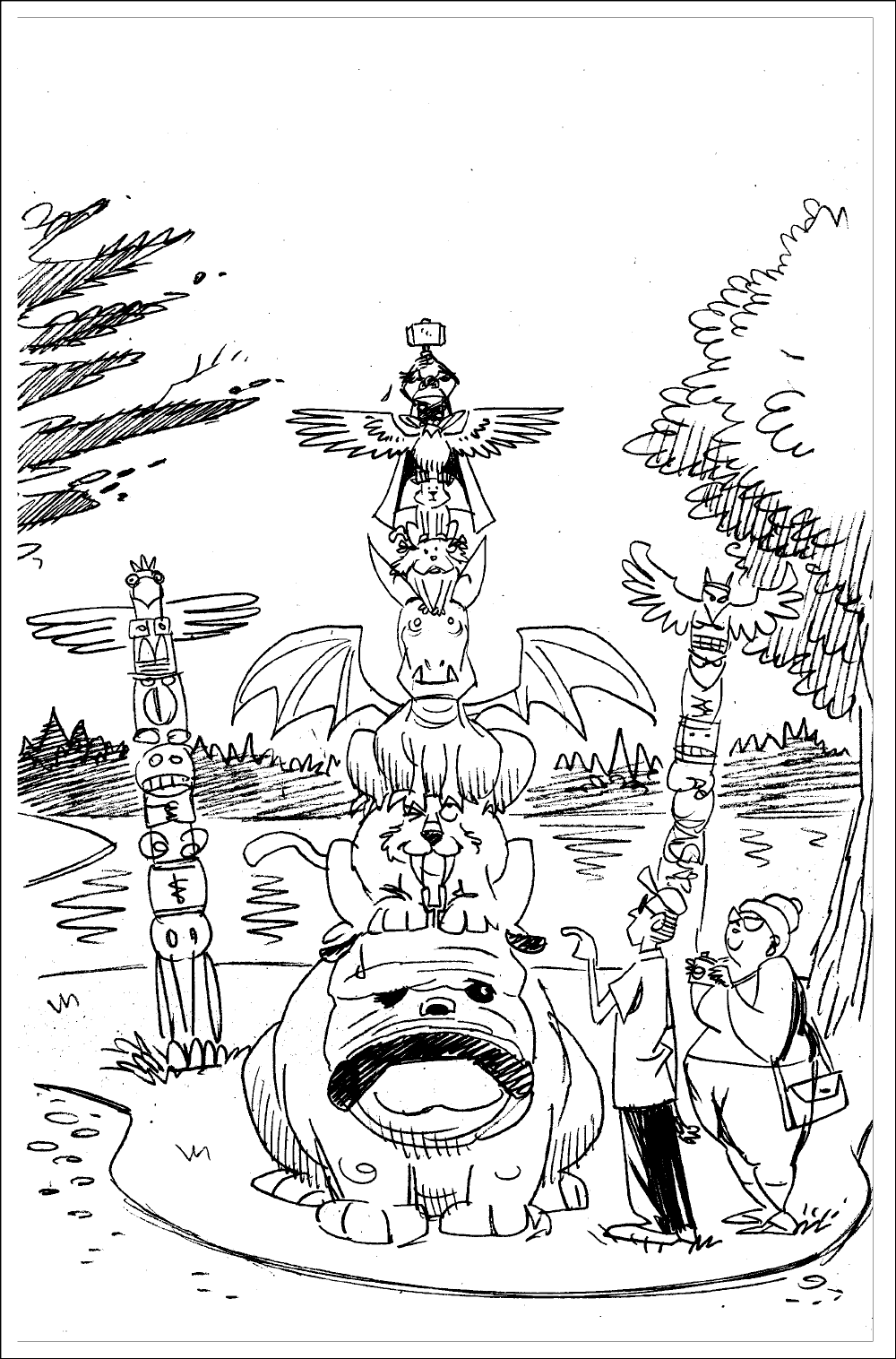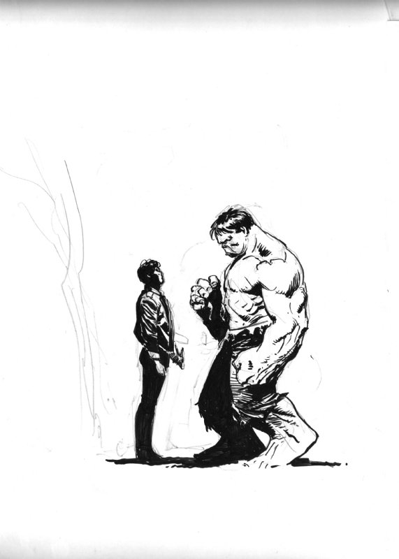 Finally, I scanned the pencils and blew them up to finished art size, printed them out as a blueline (light blue lines which can be inked without reproducing, so only the inked lines are visible), and inked everything with a No 2 sable brush and a Hunt 102 dip pen.