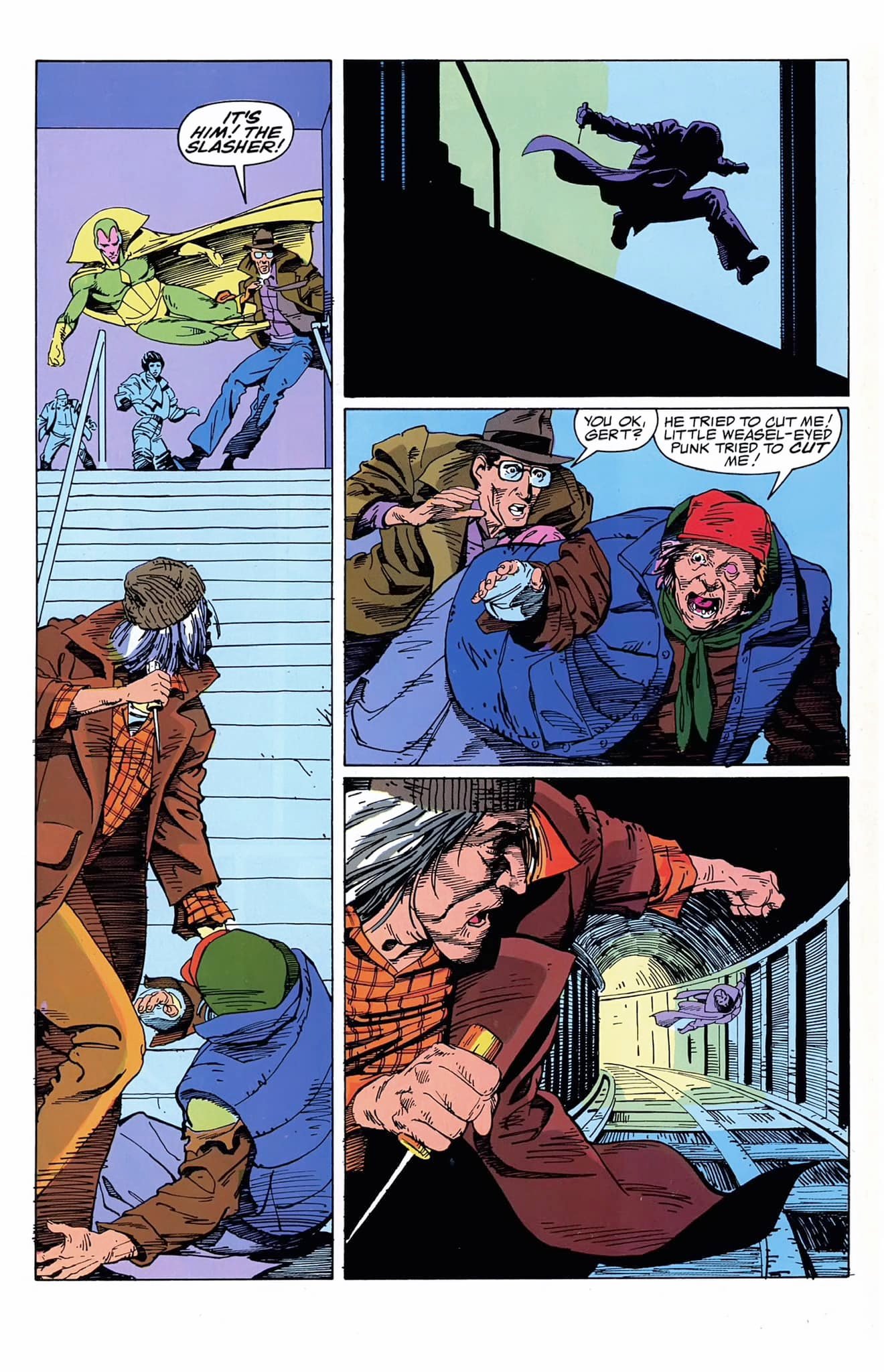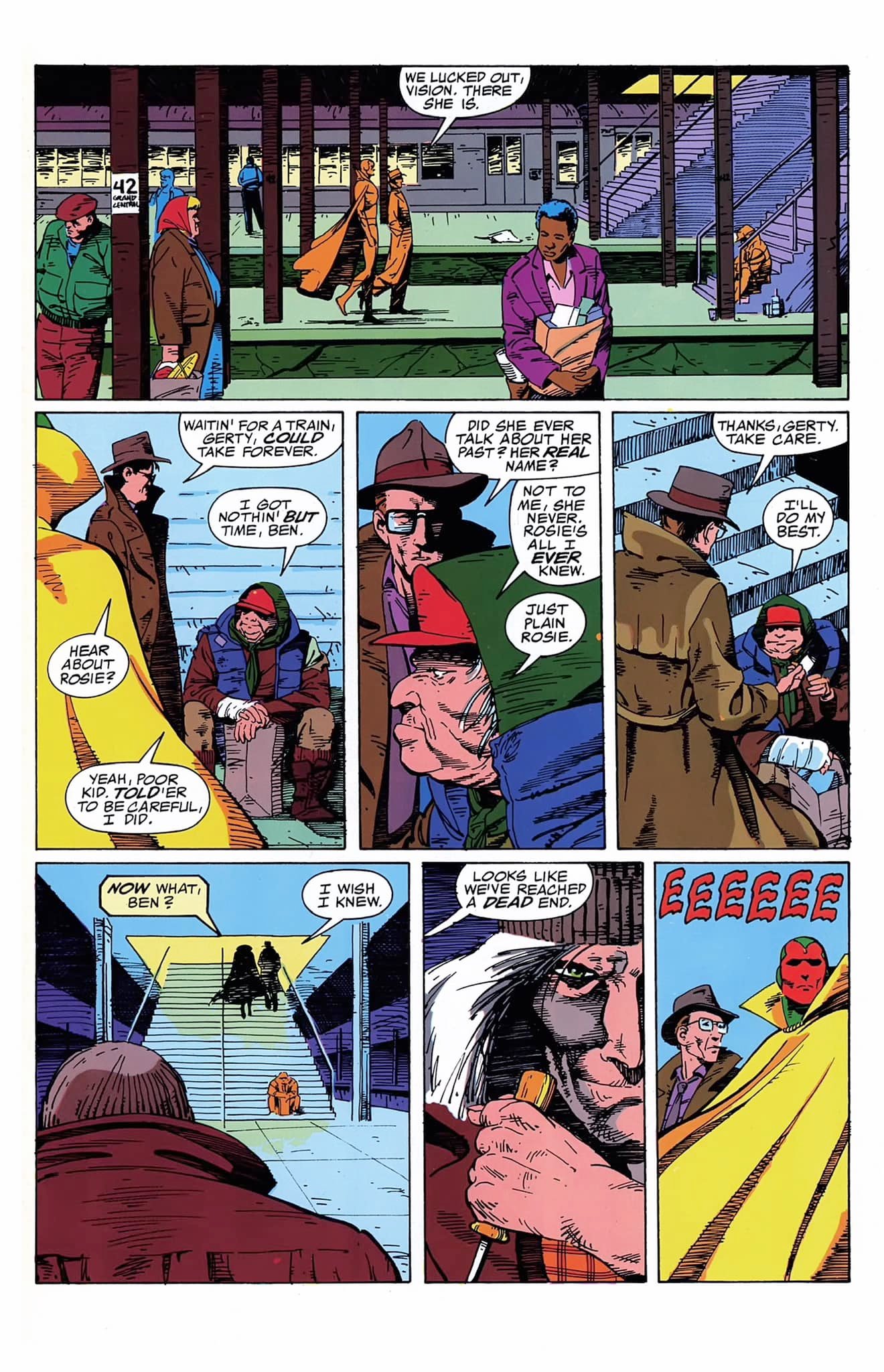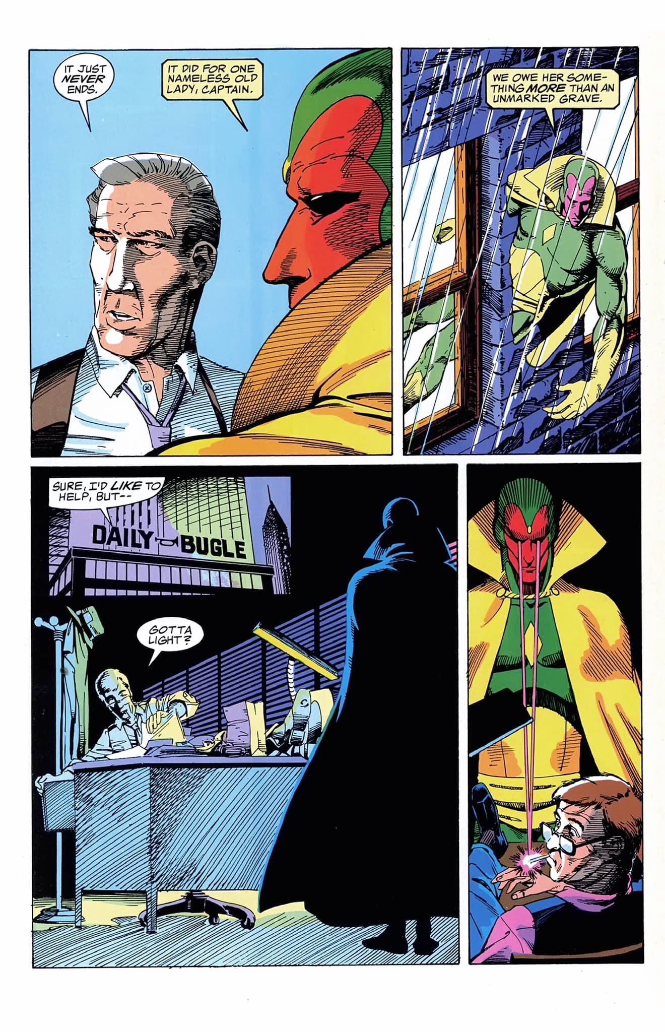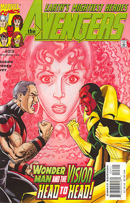 La foule est composée à la fois de personnes qui veulent des Vengeurs de couleur et de fanatiques anti-mutants. Deux thèmes déjà traités par le passé mais là, les héros pensent que quelqu’un est derrière leurs ennuis récents en manipulant l’opinion publique car tout s’est enchaîné un peu trop rapidement. La tension ne se relâche pas quand Vision et Wonder Man en viennent aux mains. La frustration du synthézoïde, qui s’explique par le fait qu’il pense que sa personnalité n’est qu’une simple réplique de celle de Simon Williams, donne lieu à un échange intéressant et nuancé entre les deux « frères »…et troublé, Vision préfère partir pour réfléchir…