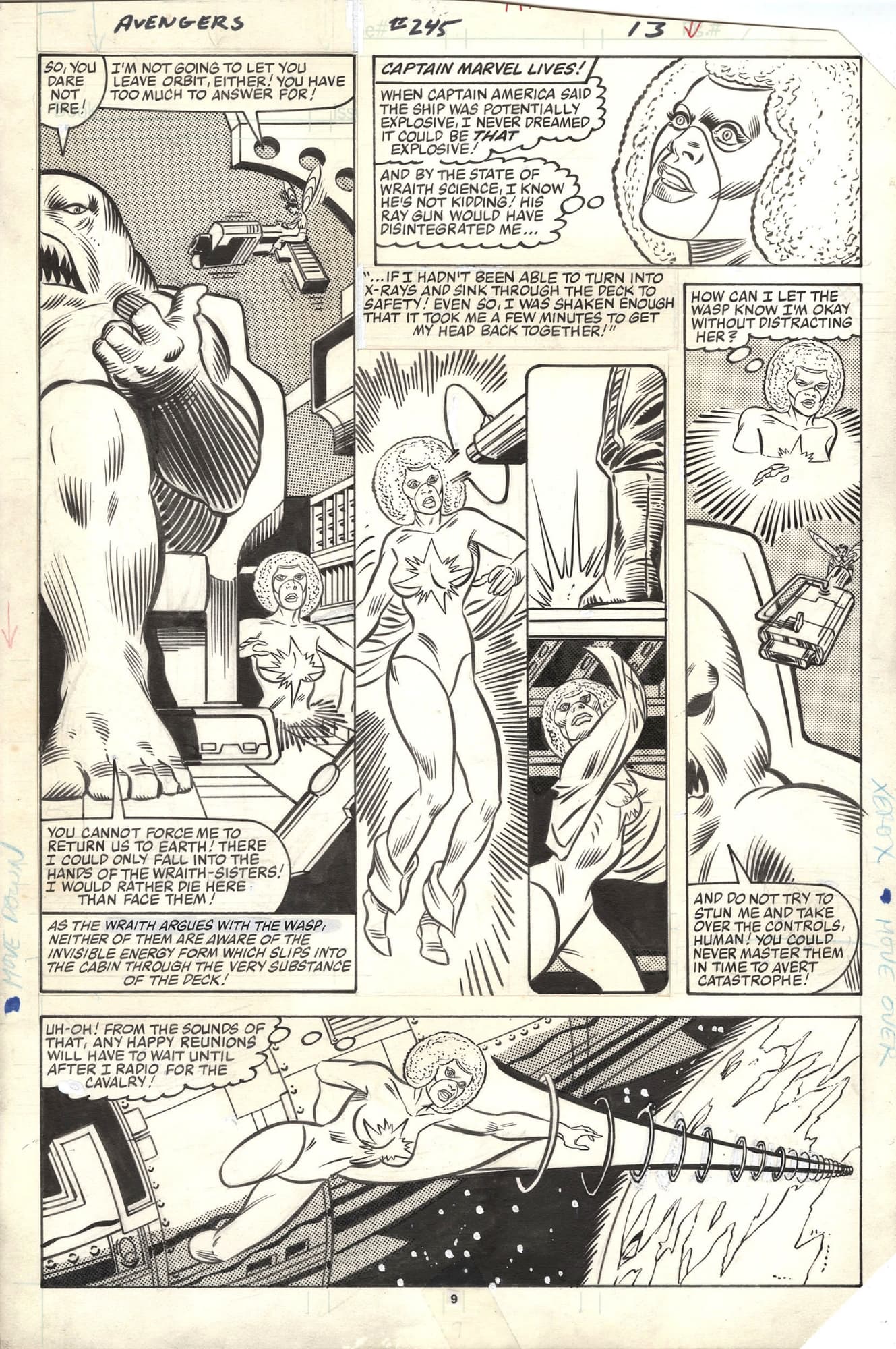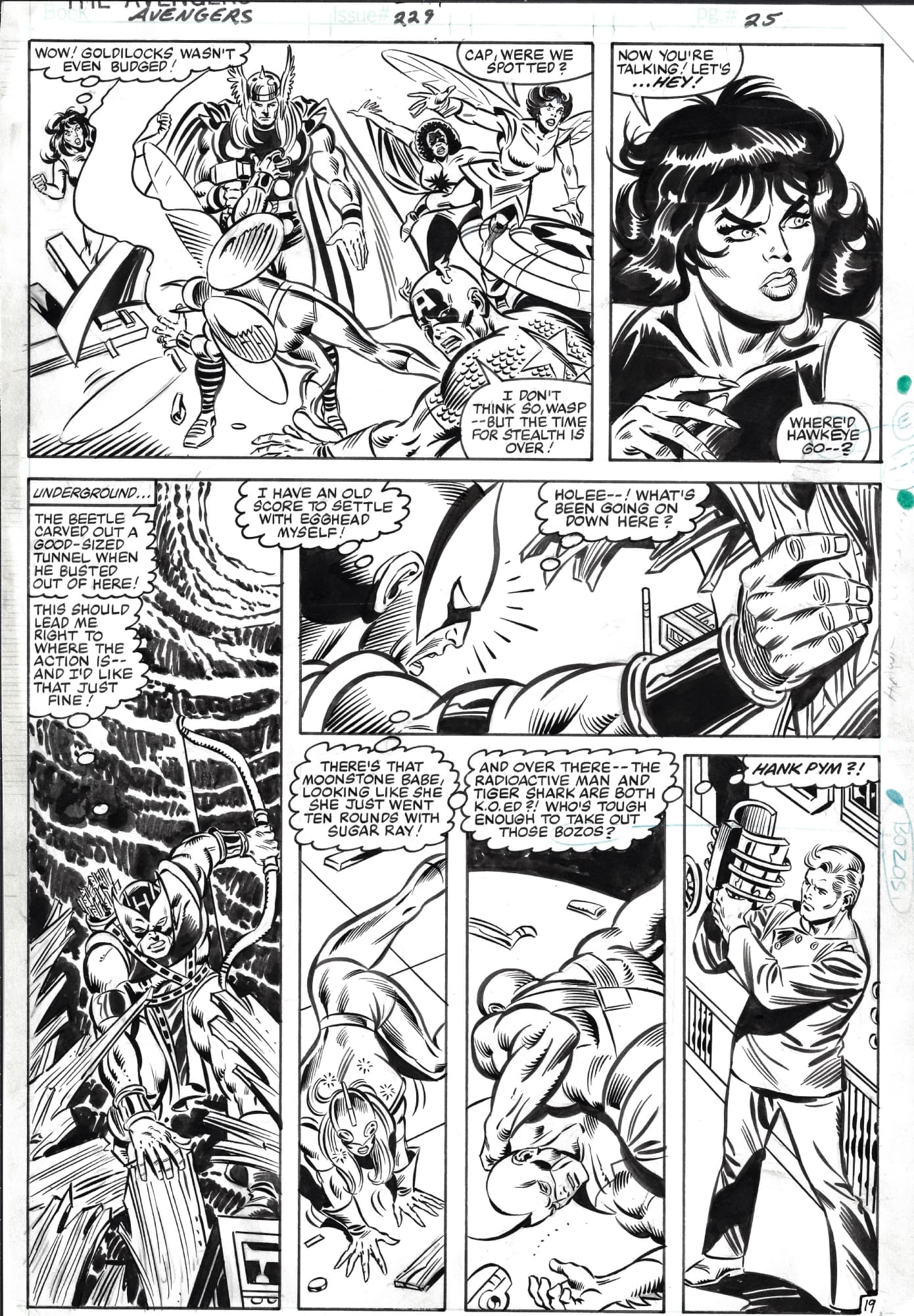 Une page d’Avengers #229 , concluant le calvaire de Hank Pym, enfin réhabilité par Roger Stern. Dessin d’Al Milgrom, encrage de Joe Sinnott (remarquez les gros coups de marqueurs pour signifier le tunnel qu’emprunte Hawkeye) :