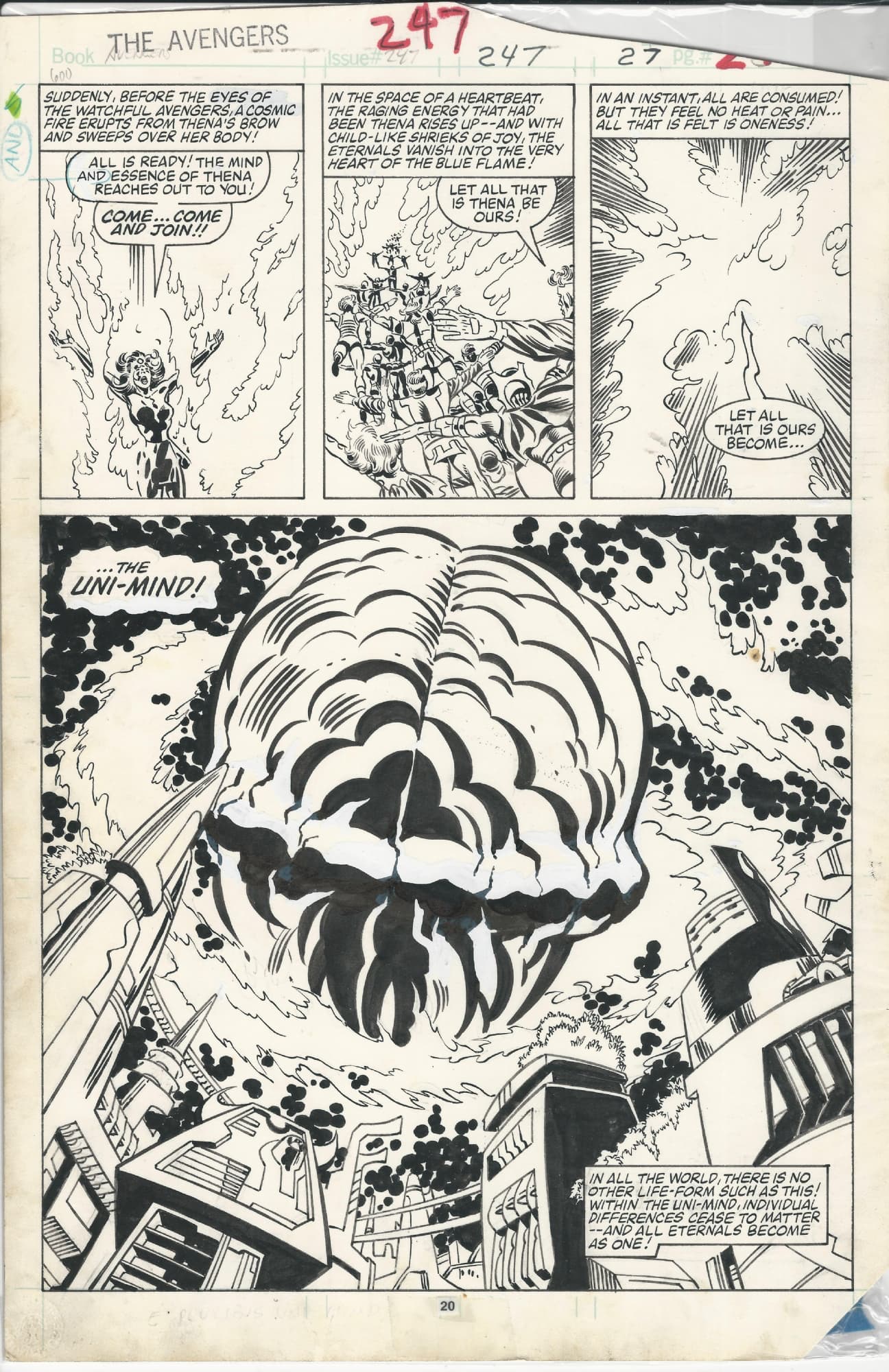 Un gran moment dans les épisodes de Roger Stern : l’apparition de l’Uni-Mind, dans Avengers #247 , par Al Milgrom et Joe Sinnott (ou comment le scénariste donne de la cohérence aux apports de Jim Starlin et Jack Kirby au sein de l’univers Marvel) :