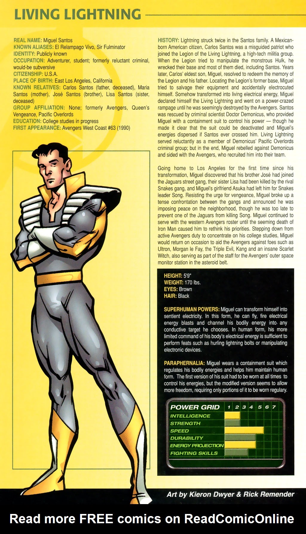 Tout ceci se déroule parallèlement à la présentation d’un nouveau personnage qui explore les ruines de ce qui ressemble à une base de super-vilains. Le lieu était autrefois le Q.G. d’une certaine Légion de l’Eclair Vivant. Les Thomas se servent bien de la continuité pour fournir le contexte avec un résumé de ce qui s’était passé dans de vieux épisodes de Hulk datant de Tales to Astonish (période Stan Lee & Marie Severin), les explicatifs se chargeant d’expliquer ce que recherche ce Miguel Santos, désireux de poursuivre l’oeuvre de son père, qui était le leader de cette Ligue (je n’ai pas plus de détails, n’ayant toujours pas lu les épisodes en question). En rebranchant deux câbles, Miguel acquiert des super-pouvoirs (c’est que c’est dangereux, ces choses-là) et devient un véritable éclair vivant !