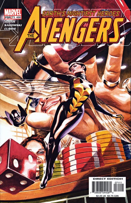 This issue of AVENGERS , #71 , was released on October 15, 2003 and hasn’t been reprinted in its entirety in years. And that, my friends, is a story. So, first off, it’s worth knowing that, as I believe I detailed in a previous Newsletter, Marvel President Bill Jemas had been growing steadily more and more dissatisfied with the writers then working for Marvel , to the point where he started up the Epic Comics program in the hopes of bringing in some fresh talent that he could mold in his image. Bill certainly didn’t like my books—we had history that went back to his earlier days working on trading cards at Fleer , so ours was a complicated relationship. To try to improve relations, at a certain point when he was trying to get stories paced out more in the manner that he preferred, I wound up having new AVENGERS writer Geoff Johns speak directly to him, and to get his notes on the long arc we were planning, “Red Zone.”Bill’s opening line to Geoff was typical of him, “You don’t know how to write.” But Geoff had been trained in Hollywood and he’d taken aggressive notes from executives before, and so rather than being cower by Bill , he met each challenge head on, and in doing so, while Bill never entirely came around on his writing, he did gain a little bit of Bill’s respect. Now, at this time, Bill was pushing for our material to be edgier. THE ULTIMATES had been launched which featured more extreme versions of the Avengers characters—more violent, more sexualized, more dangerous—and it was a huge hit. Bill wanted to push the envelope in these directions a lot more. He felt that any attention was good attention, even if it was seemingly negative. And he made these preference known to Geoff through their discussions. Consequently, Geoff plotted a sequence in AVENGERS #71 , the first issue after “Red Zone” , designed to steer into what Bill said he wanted. The issue focuses on Hank Pym and Janet Van Dyne, who had been estranged for years but who had been coming back together across the length of this run. The scene opened with a shot of a Las Vegas hotel with shouting coming from inside one of the rooms, shouting that made it apparent over the next few panels that the persons involved were Hank and Jan, and the misdirect was that Hank was striking her as he notoriously had in the past. But at the page turn, we find that Hank and Jan are rather in bed together, and that Hank has shrunk down to his ant-size in order to pleasure her more directly. It’s a dumb, adolescent shock-scene, the sort that really doesn’t have a place in a book like AVENGERS . But when Bill heard about it, he loved it, and pushed for it to be even more graphic and shocking. So these were the marching orders. End of the day, though, none of that abdicates me from my part in allowing all of this, I could have stopped this page at any point. There’s also a digression I need to talk about to give you some context for a bit of what came next. Bill was in his final days at this point, though nobody knew it yet, and he was growing more regularly erratic. Upset at the artwork in some recent issue of some title—I don’t recall which one—he decided that, going forward, EIC Joe Quesada would have to sign off on every page of every issue that was being produced. It was a tremendous bottleneck, a waste of time and resources and this only lasted for as long as Bill remained in charge, which wasn’t long. But this nonsense provided me with some good fortune. Because by the time AVENGERS #71 hit the stands, Bill was out, and so the shitstorm over this page fell directly on me alone. Fortunately, I had both the e-mails from Bill expressing his love for this scene and the sign-offs from Joe proving that everybody involved had both seen and blessed this sequence before it went to print, and so I wasn’t solely responsible, Marvel had approved the sequence. In the end, the decision was made to drop the offending page from the collected edition, and it hasn’t been reprinted since that initial printing so far as I know.