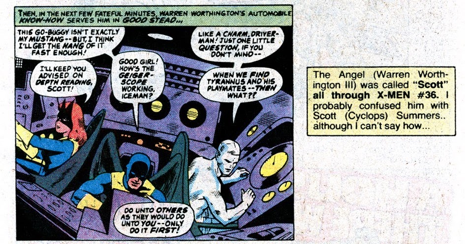 Encore dans le No-Prize Book, un extrait de X-Men #36 atteste que Warren est appelé Scott, apparemment pendant tout l’épisode :