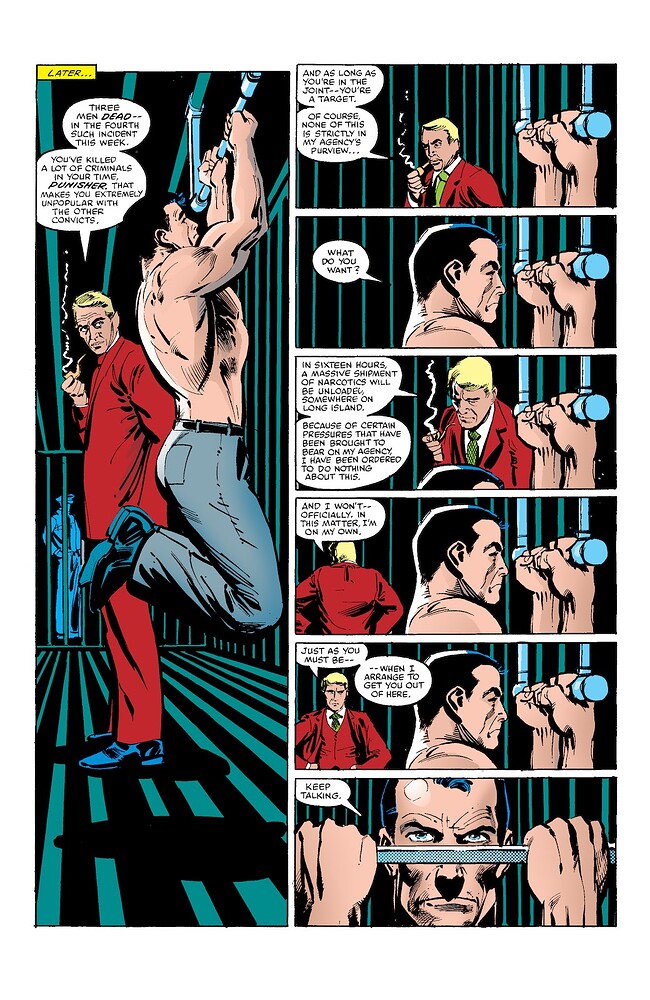 Mais c’est le Punisher qui s’évade seul, laissant son associé de fortune aux bons soins de l’administration pénitentiaire. En partant, il exprime la nature de sa mission : liquider le Kingpin.
