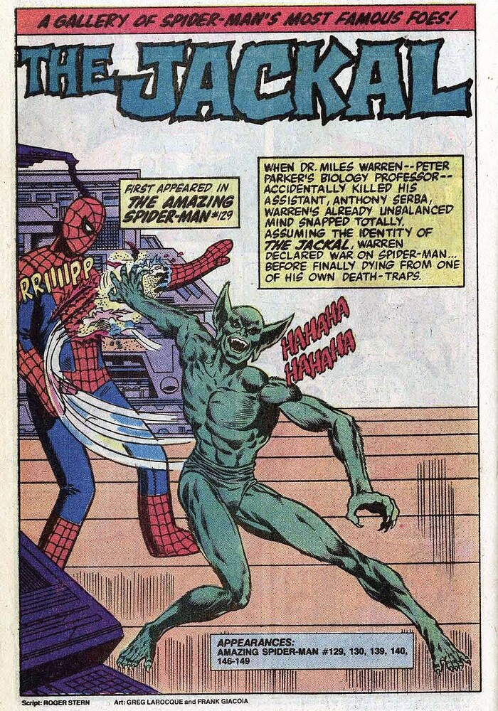 (Une page avant, on trouve, dans la même rubrique et par les mêmes auteurs, la « fiche » du Jackal, associé à la première apparition du personnage : )