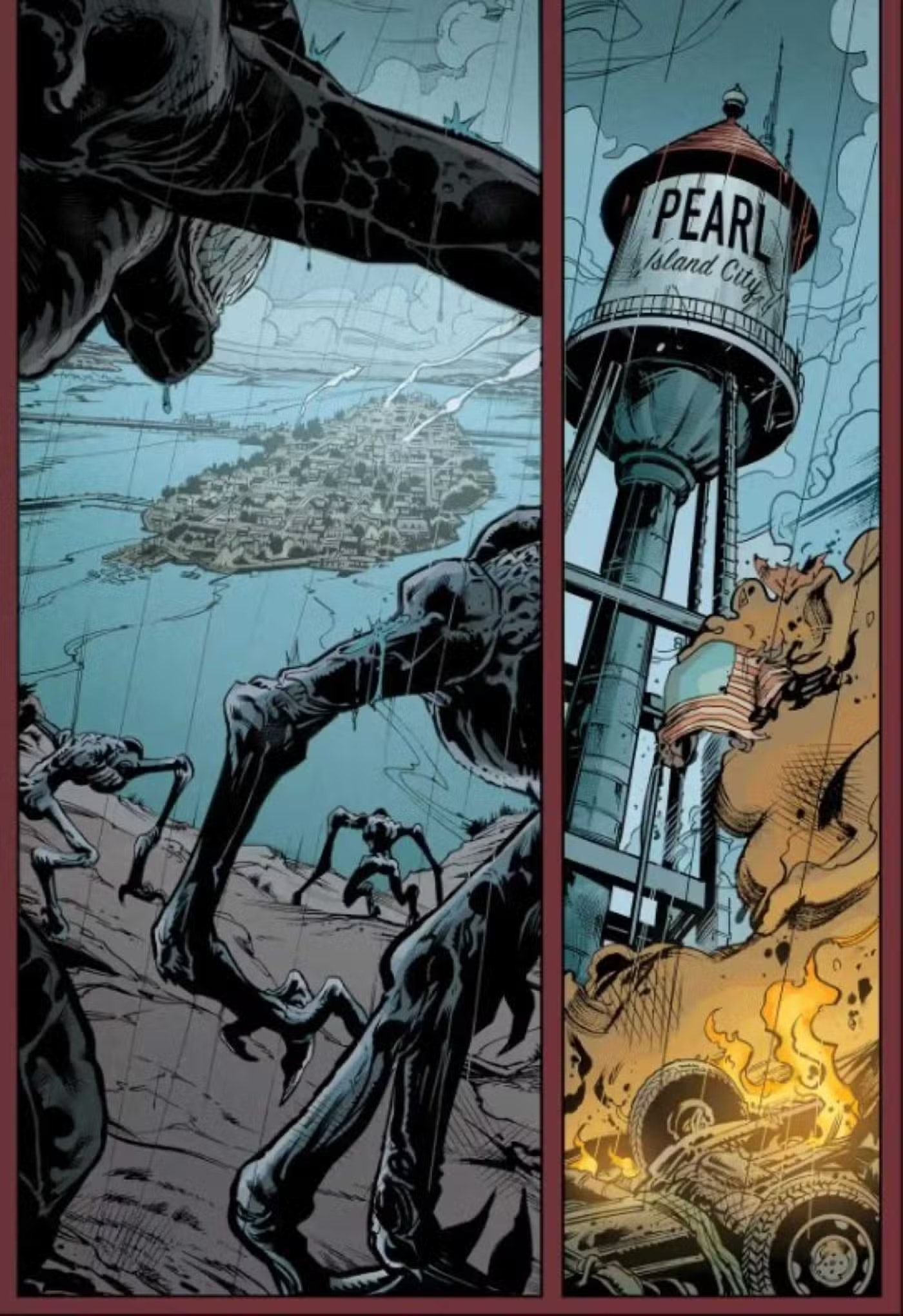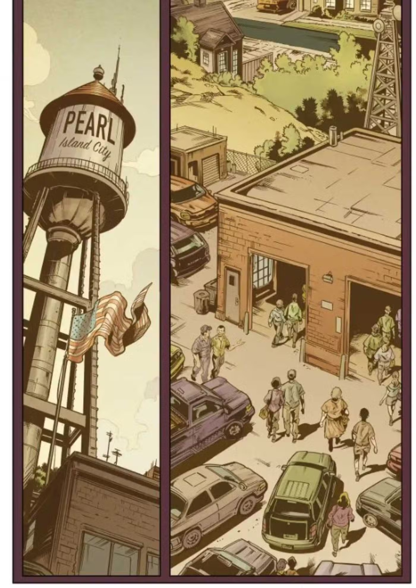 A Quiet Place: Storm Warning #1 by Phil Hester and Ryan Kelly for March 2026 now takes us to a small island town in the midwest, Pearl, Iowa. « As a franchise, I think A Quiet Place stands out for two reasons. Each movie is a relentless torrent of suspenseful action, but with a genuinely moving drama at its core. Secondly, it’s an innovative formal exercise in visual storytelling without dialogue. With A Quiet Place: Storm Warning , I feel Ryan Kelly and I have replicated those qualities, but in an entirely different medium. » – Phil Hester