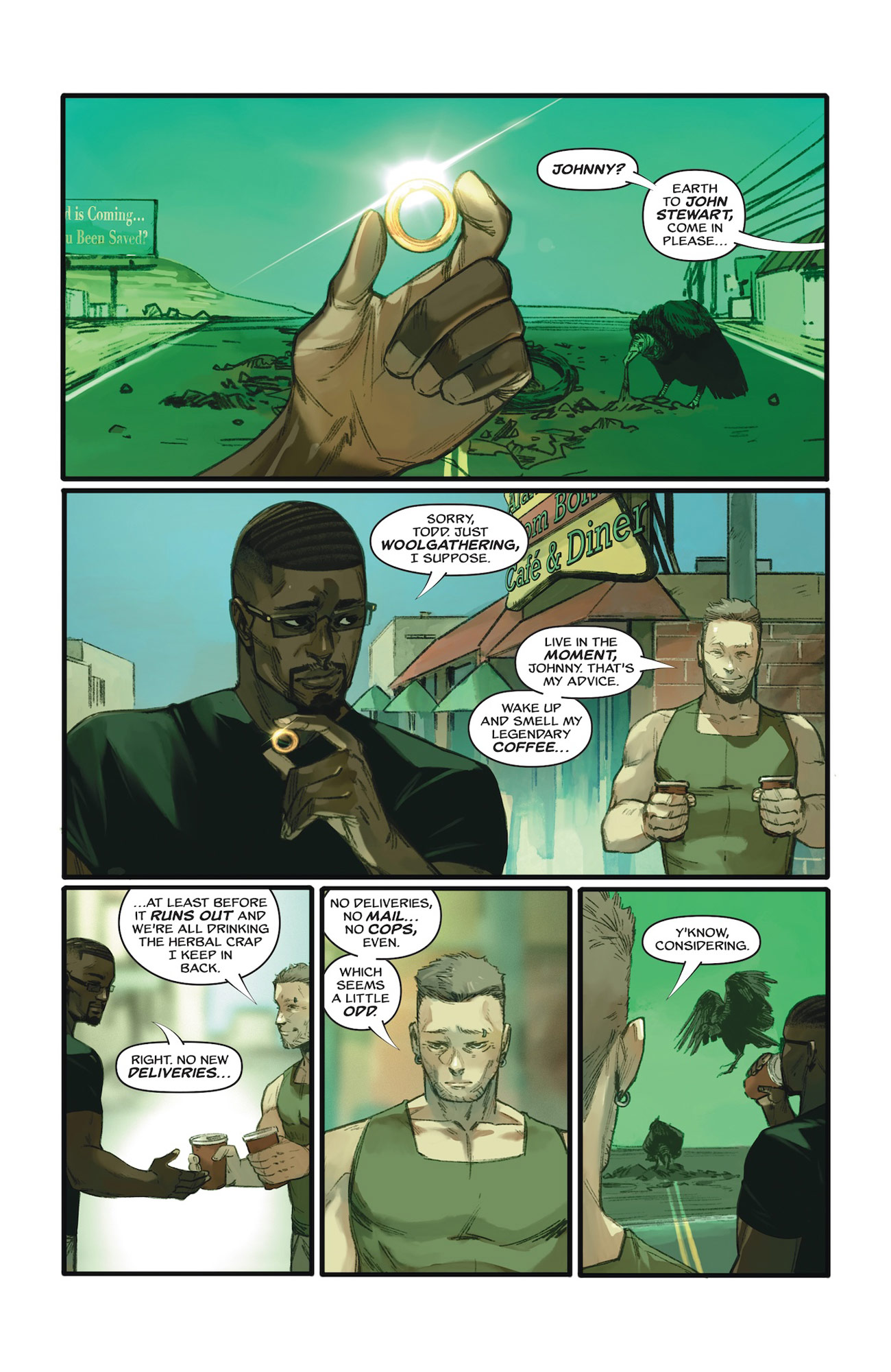 Intéressant ; mais lent et laid, quand même. Al Ewing enchaîne doucement, non pas par un épisode sur Jo elle-même (après un #1 sur Hal seul), mais sur des échanges. Jo confronte Hal dans le diner ravagé, et par leurs discussions, l’on comprend que « The Abin Sur » est venu se présenter aux gens de la ville, pour « juger » qui vit dans « la peur ». Le shérif Guy Gardner tente de gérer un tel premier contact, semble bien s’en sortir - mais The Abin Sur le tue, tue d’autres, mutile d’autres. Hal prend une arme et le confronte, mais John Stewart le stoppe et négocie avec The Abin Sur, qui acte que John sait vivre avec la peur. Il s’en va, et l’on voit ensuite que Hal, John et Jo tentent de savoir quoi faire avec le dôme d’émeraude, et John pense pouvoir utiliser… un anneau, pour ça ? Avec, au présent, Hal qui est rongé par la force noire, qui est ancienne et dit vouloir absorber toute émotion.