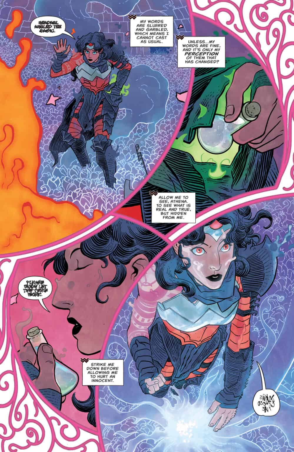 Prenant. Tout en montrant un flashback où une jeune Diana est confrontée violemment par Artemis, où elle est prête à subir les tortures divines sans réagir mais où elle refuse que du mal soit fait à une tortue, puis en révélant que Hécate « pilote » la formation de Diana comme arme anti-système divin malgré les doutes sentimentaux de Circé, la plongée dans le labyrinthe se poursuit. Diana sauve et évacue la sirène, mais est prise par un poison et ses sens se troublent pour sauver une scientifique et affronter un monstre envoyé par la Reine Clea.