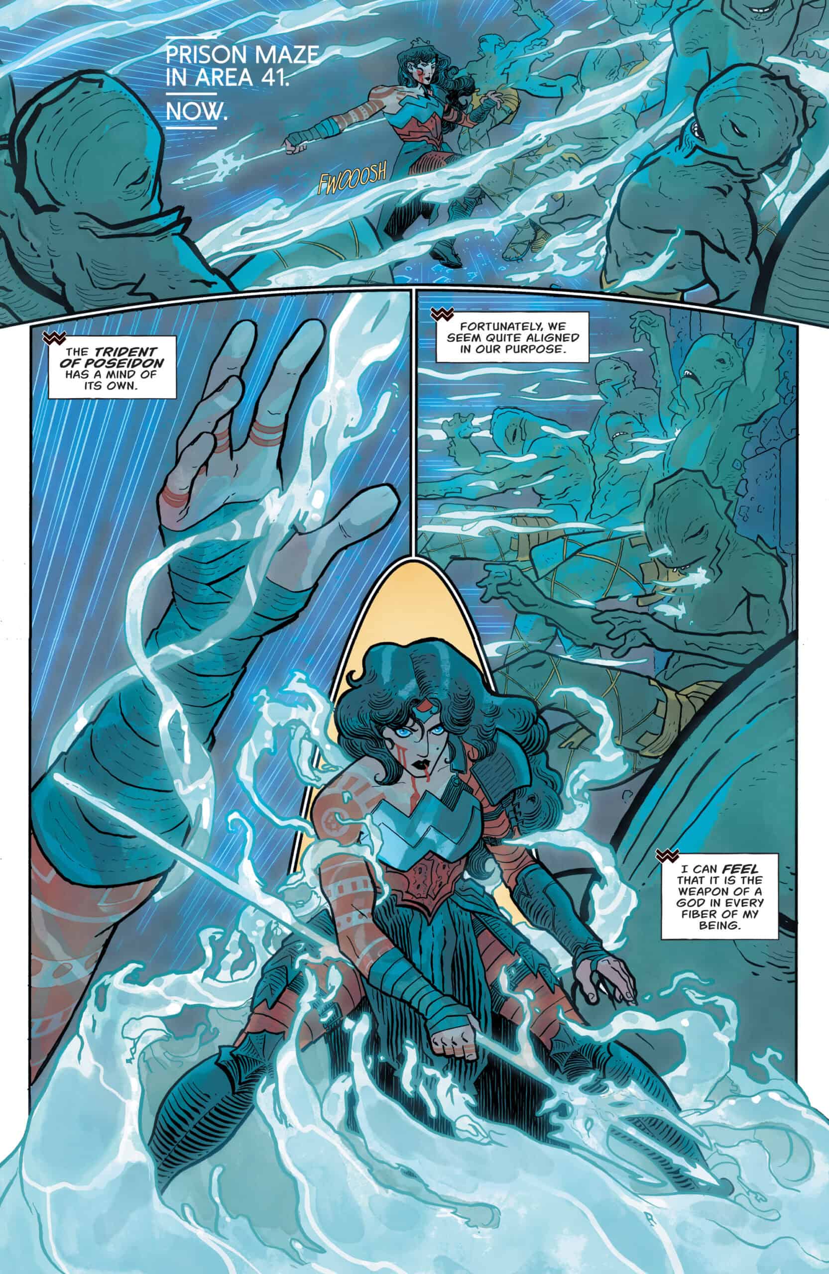 Sublime. Kelly Thompson achève formidablement sa saga, avec une Diana extraordinaire et des moments superbes. Diana affronte Clea et a transformé son bâton en Trident de Poséidon par Magie, ayant réussi à créer un trou dans le labyrinthe vers l’Océan Pacifique. Elle envoie Ferdinand vers la sortie formée dans les murs et allant vers sa base, où Ferdinand parvient à apaiser la sirène qui hurlait et rendait fou tout le monde par peur. Io hésite à passer le portail jusqu’au bout, car son passage va le sceller, mais Diana convainc Clea de fuir et de ne plus être une monstre ailleurs. Diana guide Clea et les Fish-Men ailleurs, leur laissant la liberté, et elle revient à sa base - où elle apprend par ses amis que Io a été frappée par la foudre en arrivant, et elle a disparu… mais elle est en réalité téléportée à Themyscira, où elle annonce à Hippolyta que sa fille est vivante, ce qui la comble de joie !