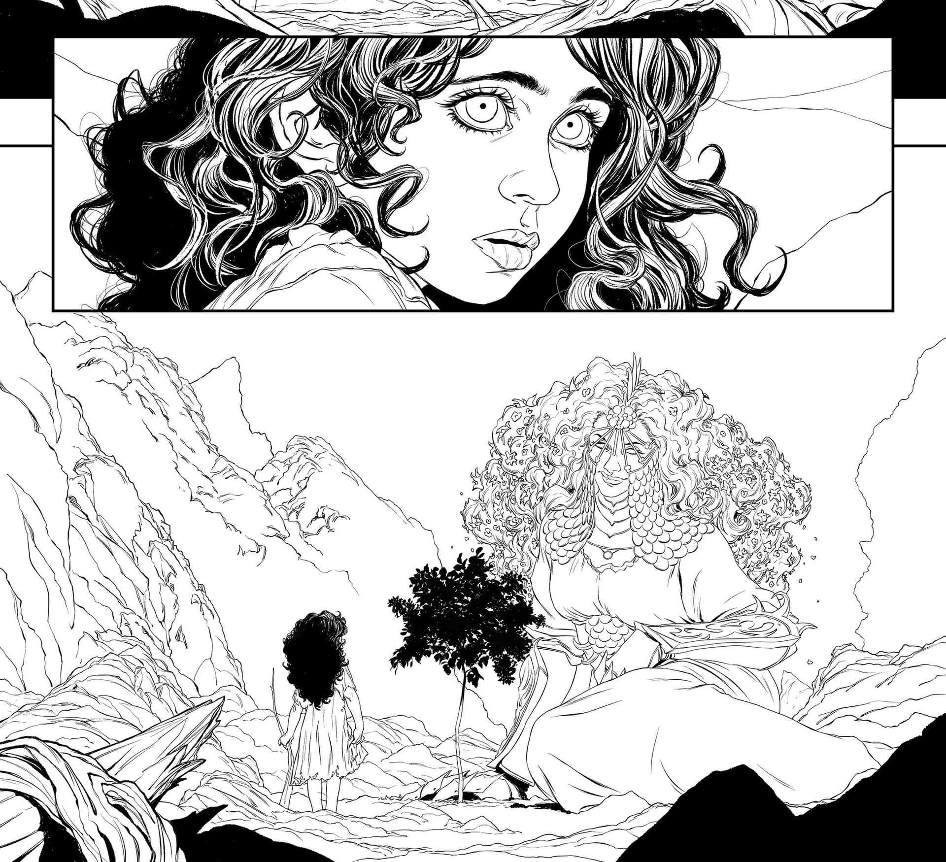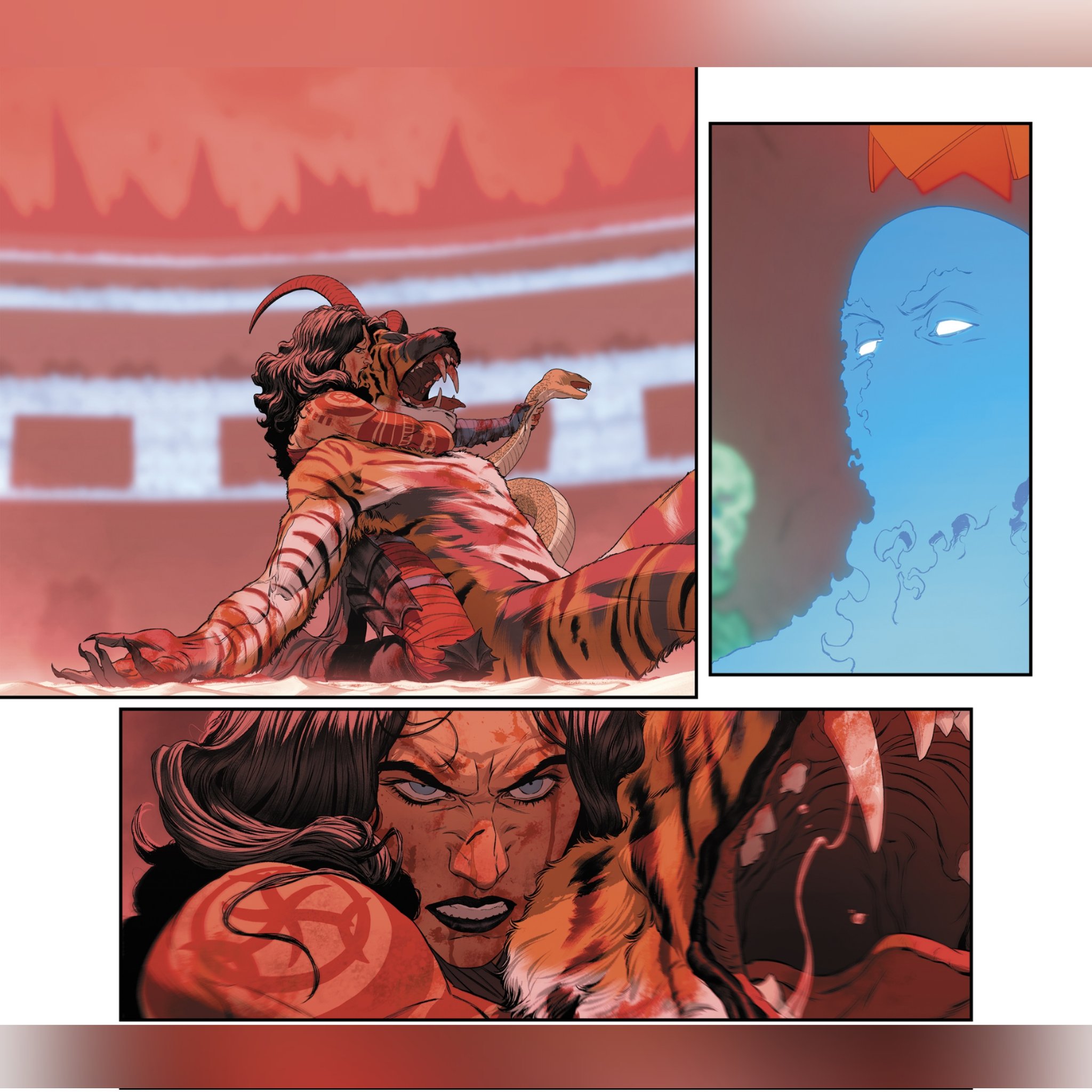 Prenant et bien fait. Kelly Thompson enchaîne avec, outre un flashback confirmant comment l’ingéniosité et la noblesse de la jeune Diana lui a attiré les bonnes grâces des déesses, la Diana adulte qui se remet de l’empoisonnement et croise dans le labyrinthe… Io, Amazone échouée ici depuis avant la reprise par les Humains. Io révèle qu’une communauté s’est organisée contre Clea et ils cherchent à fuir par des tunnels. Diana identifie sa sortie sur le plan du labyrinthe tatoué sur Io (PRISON BREAK!) puis va confronter Clea en s’alliant à une chose consciente mais blessée ici. Et alors que ses proches aident la sirène qui s’anime agressivement chez eux, Diana retourne l’arme de Clea contre elle…