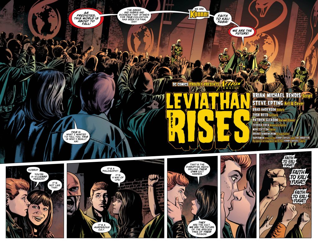 Les scénarios de Brian Bendis ont toujours été de grande qualité sur Action Comics, mais son lancement de ce story-arc sur Leviathan est vraiment très bon. Plongeant pleinement dans cette ambiance « polar », surfant sur les organisations secrètes, occultes et/ou gouvernementales de DC, l’auteur s’immerge idéalement dans cette ambiance de conspiration.