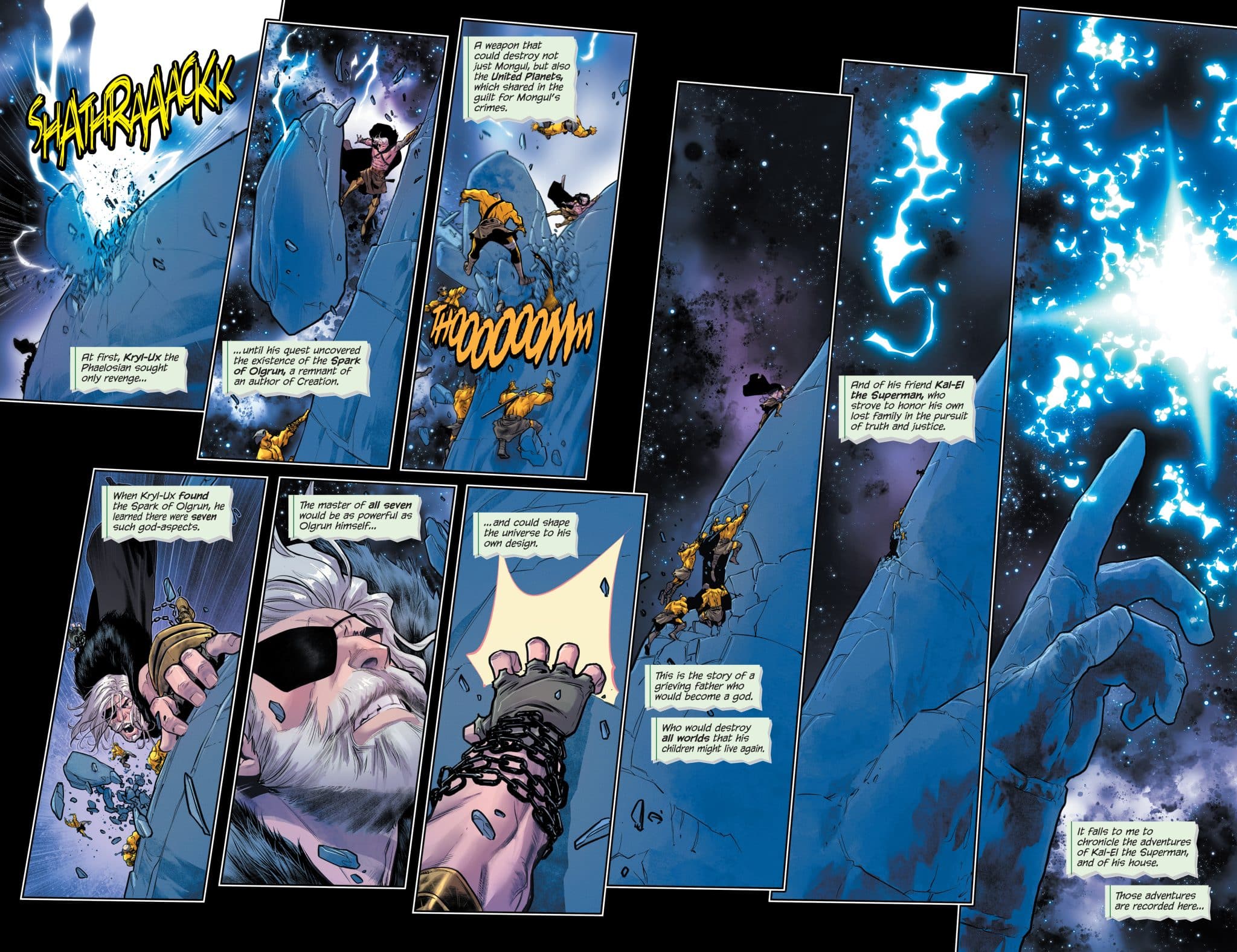 Suite directe de la Saga Warworld et des éléments disposés dans les comics Future State, ce lancement n’est pas newbie-friendly mais est agréable. Alors que Clark profite de voir grandir Osul-Ra et Otho-Ra, deux jeunes Kryptoniens de la branche des Phaelosians abandonnés sur Warworld et libérés par Clark. Osul dispose d’une part de pouvoir divin d’Olgrun, lié à la Création, et Kryl-Ux (Phaelosian acharné à sauver ses enfants en s’emparant de plusieurs aspects d’Olgrun dans l’univers) attaque avec des Warzoons pour enlever Osul-Ra. Il fait aussi disparaître Clark, et des journaux de Kara évoquent ses ravages sur Terre et ailleurs… alors que Superman réapparaît dans le futur, vers son descendant Ronan, fils du dernier Superman de la Terre !