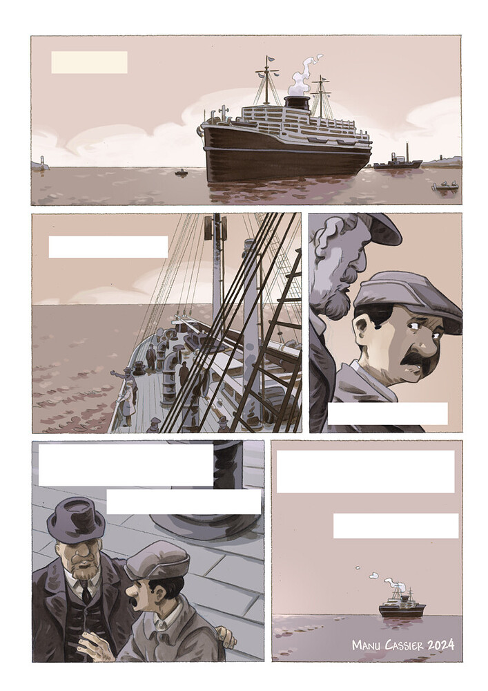 La planche ici dévoilée, dont j’avais déjà montré la version crayonnée, est bien entendu tirée de l’album en cours sur Albert Kahn.