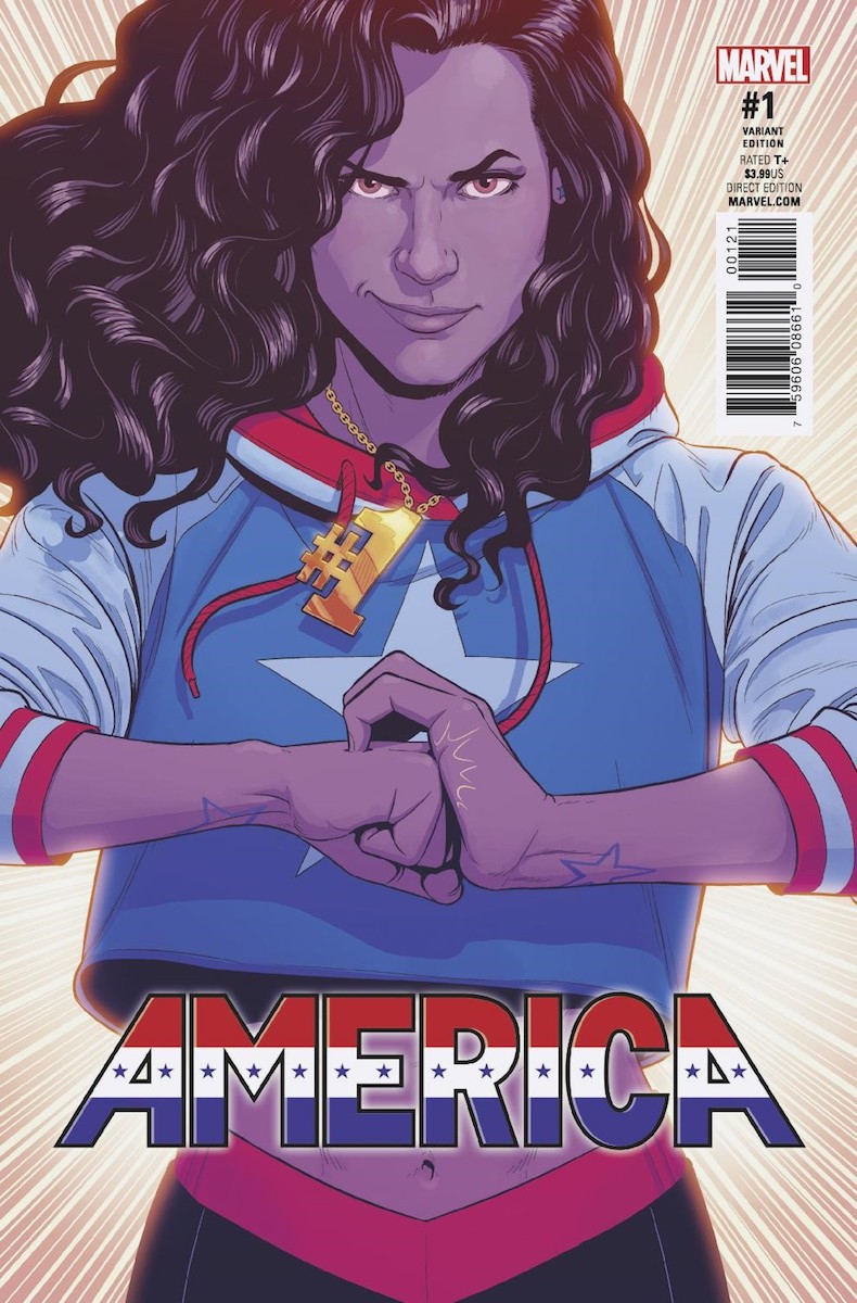 [quote]Everyone’s favorite no-nonsense, hard-hitting heroine – America Chavez – is now starring in her very own series! That’s right, True Believer, it’s dimension-punching, high-octane super hero action as only the fan-favorite character can supply. And Marvel is pleased to present your very first look inside the hotly anticipated AMERICA #1 – coming to comic shops everywhere on March 1st! Superstar YA writer Gabby Rivera (Juliet Takes a Breath) joins critically acclaimed artist Joe Quinones (Howard the Duck) to take Marvel’s Latina powerhouse to the next level!