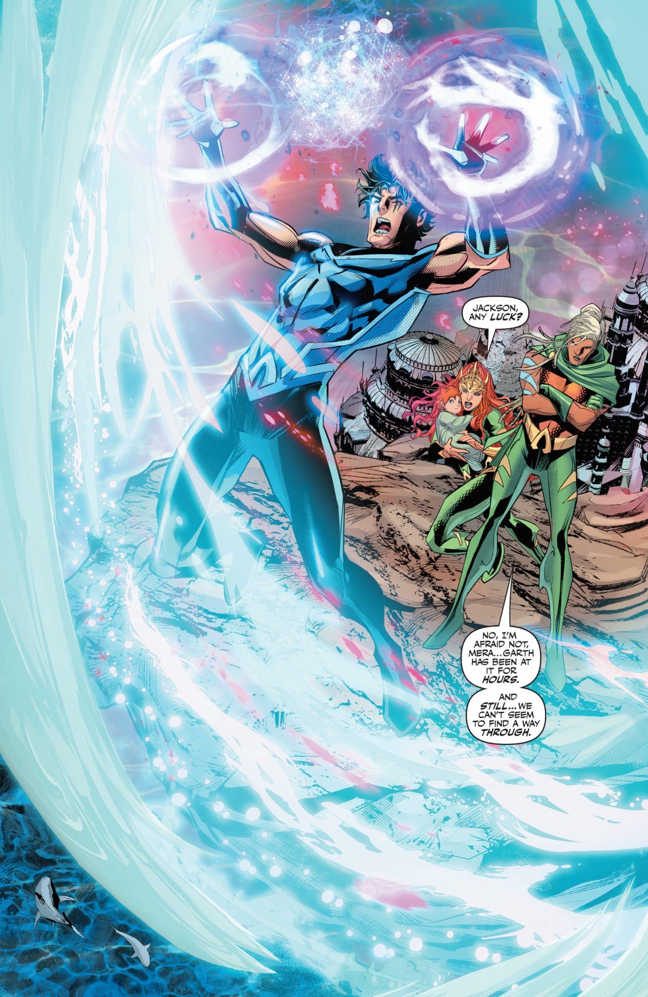 Mera and the mystery of Atlantis unravels, even as Andy moves towards her ultimate goal and Arthur contends with the power of the Blue! But is this power too much for even a KING to contend with? An oceanic onslaught unloads on the king of the seven seas, and the connection between the DARK TIDE and DARKSEID is at last revealed!