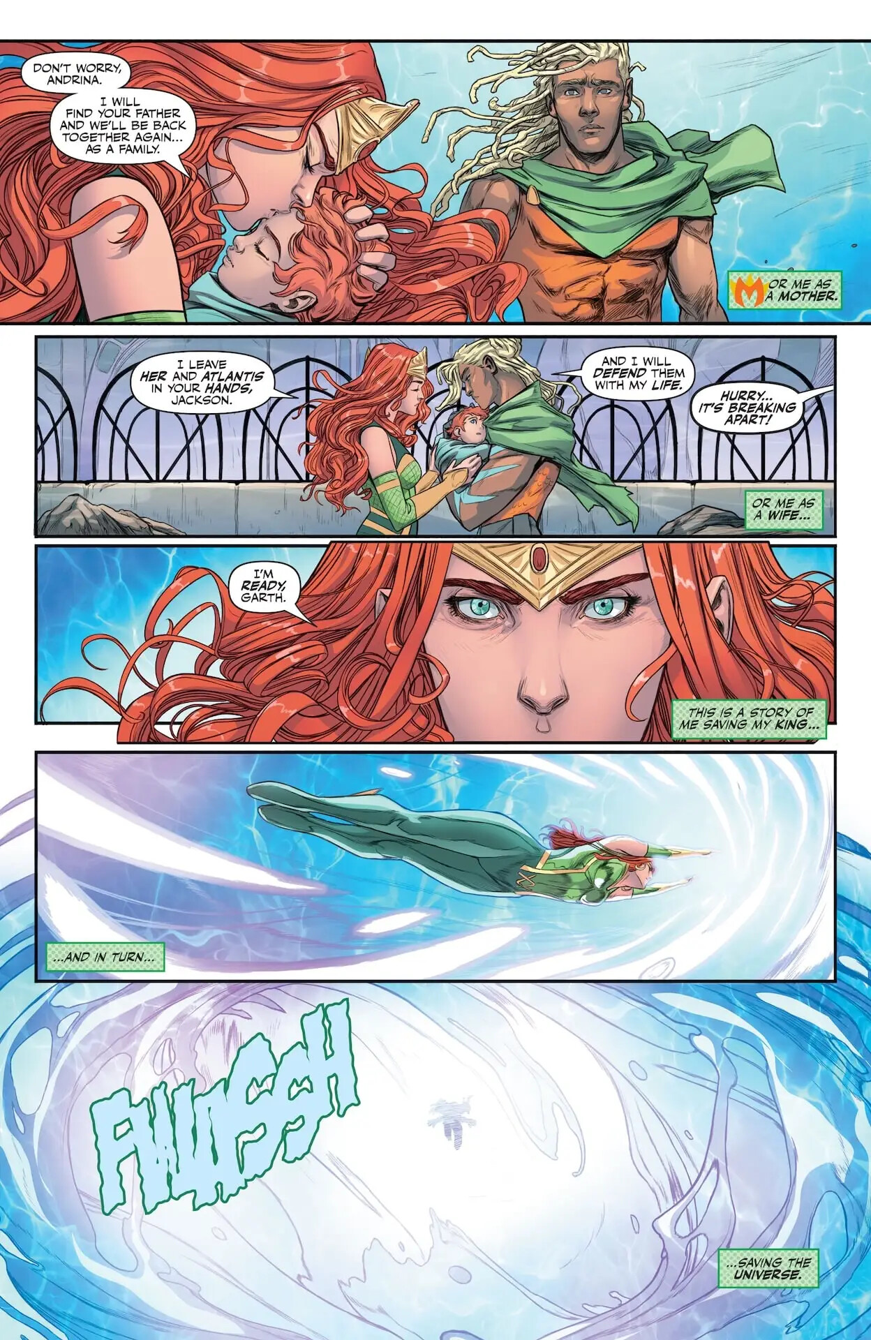 Arthur’s quest to save his people has hit a devastating dead end…but hope is not lost! Together with the Wizard Arion, Aquaman must channel the incredible power of Thalassa the Trilance Saber to escape the dungeon barge descending into the blue and uncover the last desperately needed clue to save the people of Atlantis! But floating amongst all this blue appears to be…a shimmer of green?