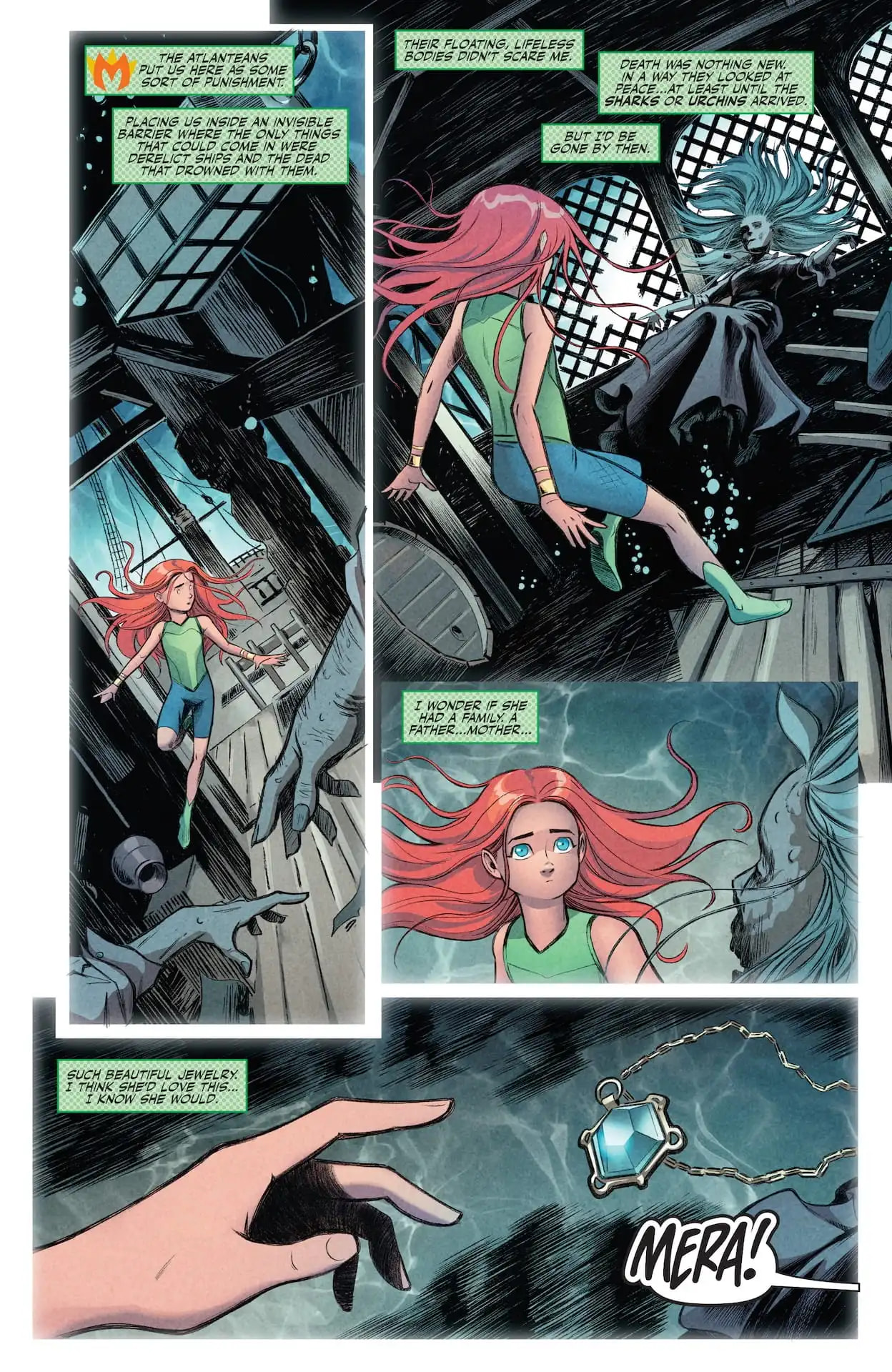 Correct. Jeremy Adams occupe le terrain durant DC K.O., avec juste un léger passage sur Arthur en pleine bagarre puis concentration sur Mera. Celle-ci arrive à Xebel et croise un Nereus exsangue. Celui-ci indique qu’une femme ressemblant à Mera est venue proposer une voie pour ramener la population en dehors de leur prison, mais les pilules données ont transformé les gens en doubles plus âgés d’Atlantes. C’est bien Andy, la fille adulte (supposée finalement) de Mera et Arthur, que l’on voit provoquer une réunion des rois sous-marins et exiger leur soumission avec attaque brutale pour les récalcitrants. Et Mera se rend compte, de son côté, que la statue de sa mère morte a disparu de son emplacement…