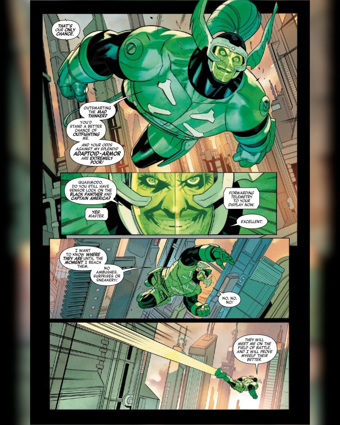 Fort sympathique pour ce que c’est. Jed MacKay avance efficacement sa petite saga qui fait vague tie-in à One World Under Doom, en s’amusant avec deux membres des Avengers et quelques super-vilains nazouilles mais rigolos à taper. On voit ainsi d’abord T’Challa qui a pacifié la dimension / prison en lien avec The Impossible City, et en revient par gros coup de chance au moment où Sam Wilson est seul (avec armure d’une extension de The Impossible City, dont l’essence est contrôlée par l’I.A. Quasimodo du Mad Thinker) face aux Masters of Evil. Ils affrontent ensemble Mr Hyde, ça tape dur et Sam le bat en brisant son esprit en exhibant la tête de Madcap qu’il a récupérée avant. Ils confrontent ensuite Exterminatrix, que T’Challa bat alors que Sam se fait avoir. Seul demeure le Mad Thinker, qui a tout prévu et va les confronter avec une armure basée sur le Super-Adaptoïde.