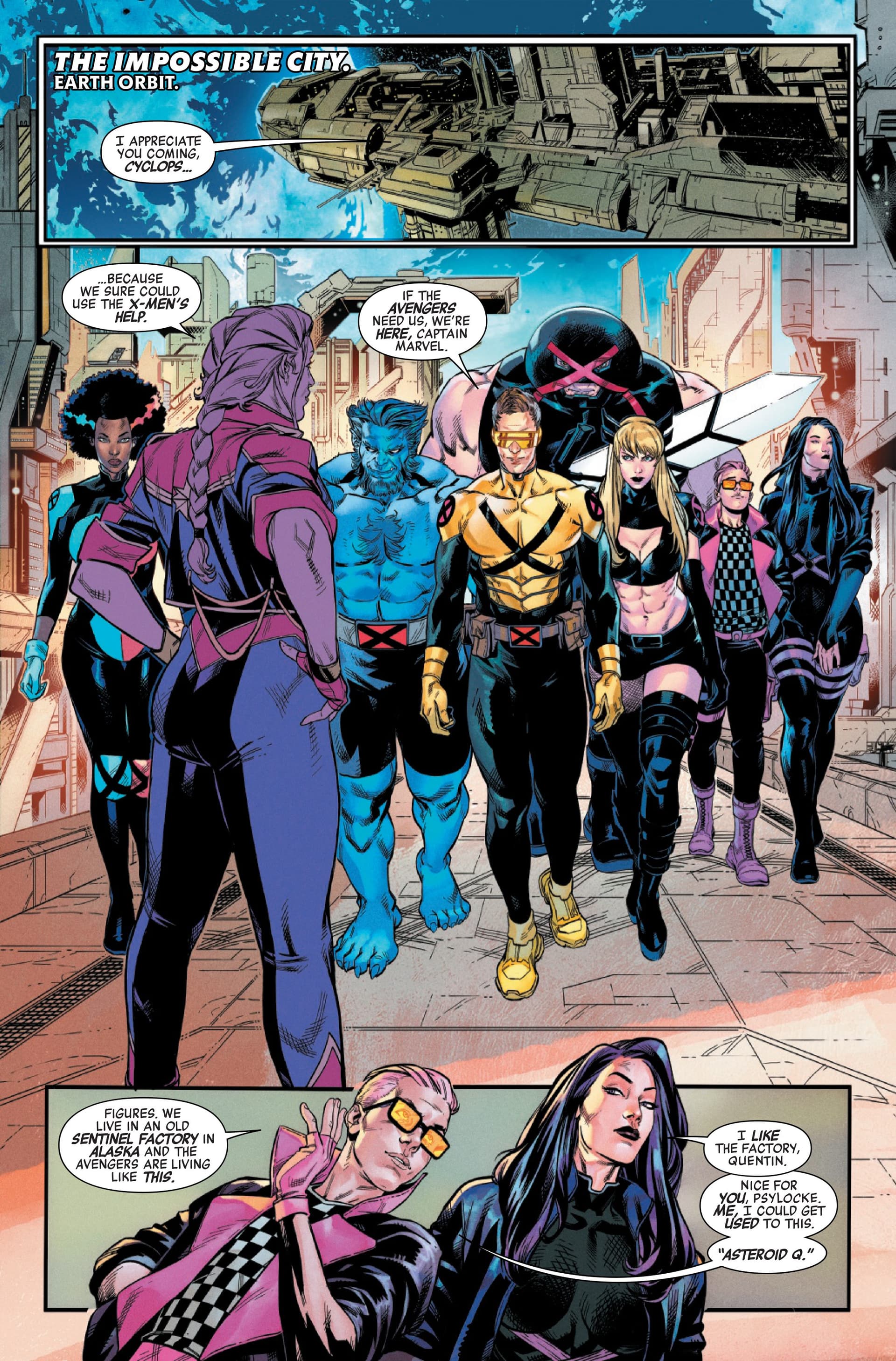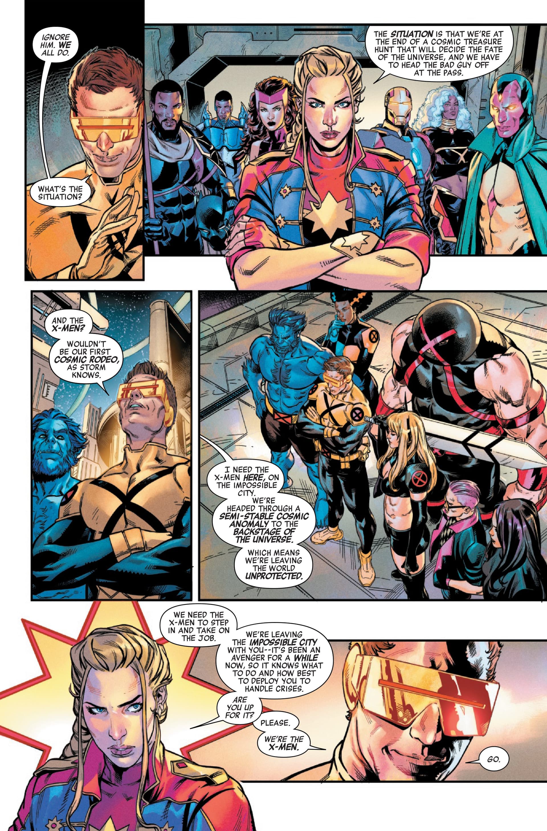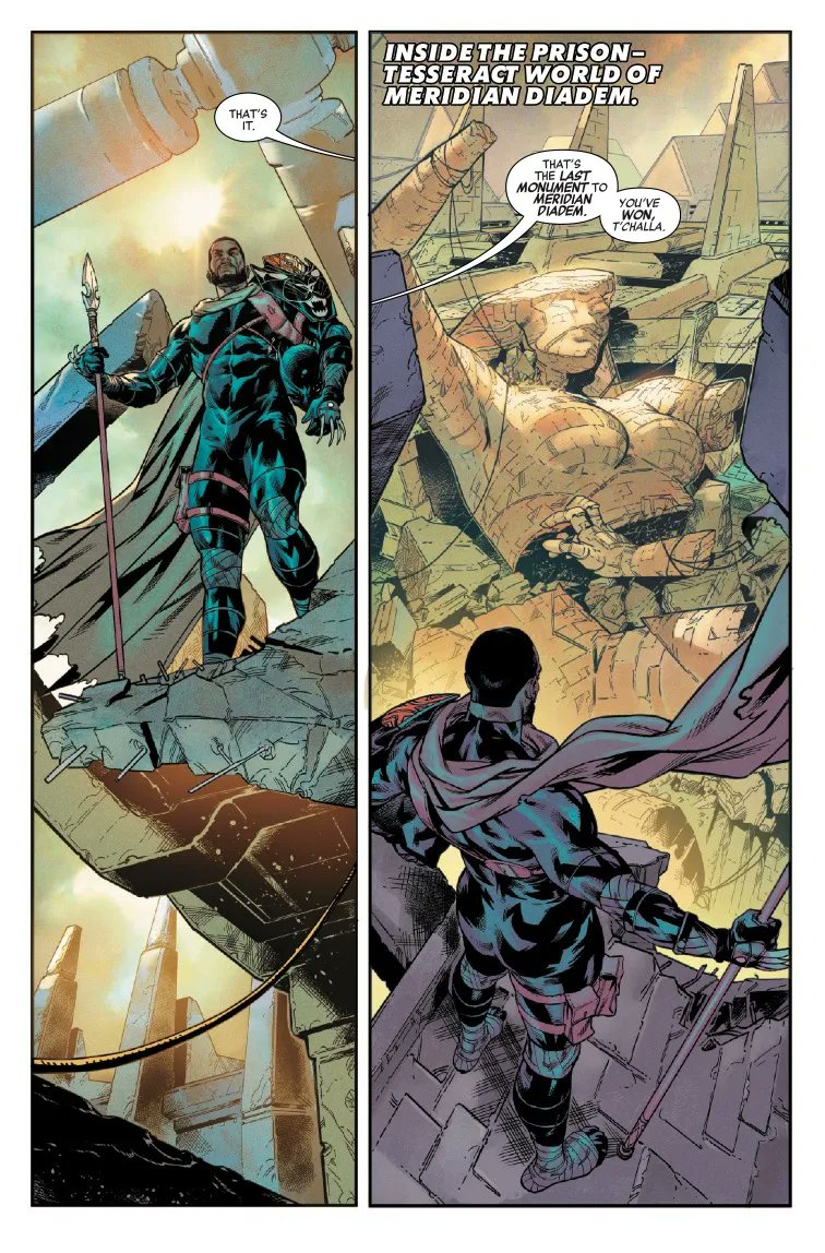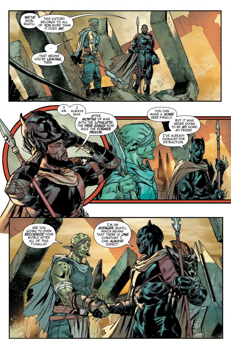 Final simple, efficace et réjouissant pour ce que c’est. Jed MacKay achève la bagarre entre Sam Wilson / The Impossible City / Black Panther contre le Mad Thinker, qui a une armure Super-Adaptoïde après que ses Masters of Evil aient été vaincus. Ça se bagarre fort, le Mad Thinker a prévu beaucoup d’attaques, mais Sam & T’Challa font diversion car l’excroissance de The Impossible City qui est avec eux est partie prendre le contrôle de l’armure de Dreadknight, qui a les droits pour bloquer la projection de la ville volante vers New York. Et cela permet de faire revenir les autres Avengers, pour défaite du Mad Thinker. Ça papote ensuite, T’Challa indique que son voyage lui a permis d’encaisser les événements et donc d’accepter Storm dans l’équipe malgré et avec leur passif, puis Carol rassure Sam sur sa place. Celui-ci a compris, et empêche même Madcap de relancer l’attaque… car il peut assurer que Captain America sera toujours là pour bien faire.