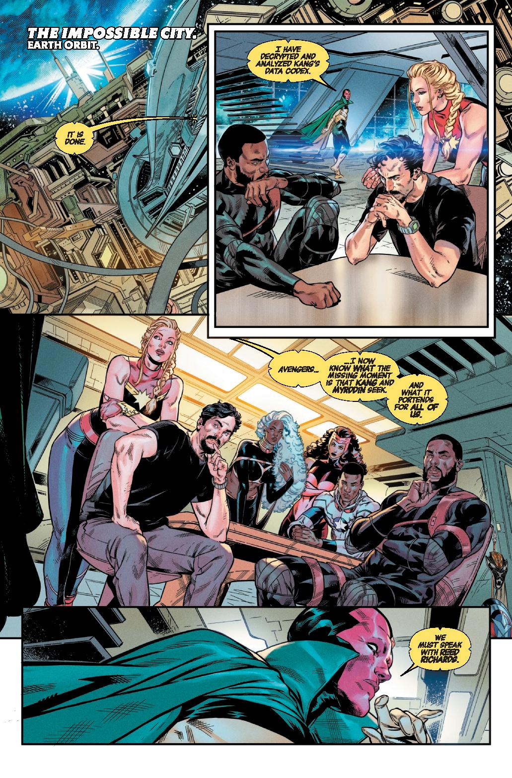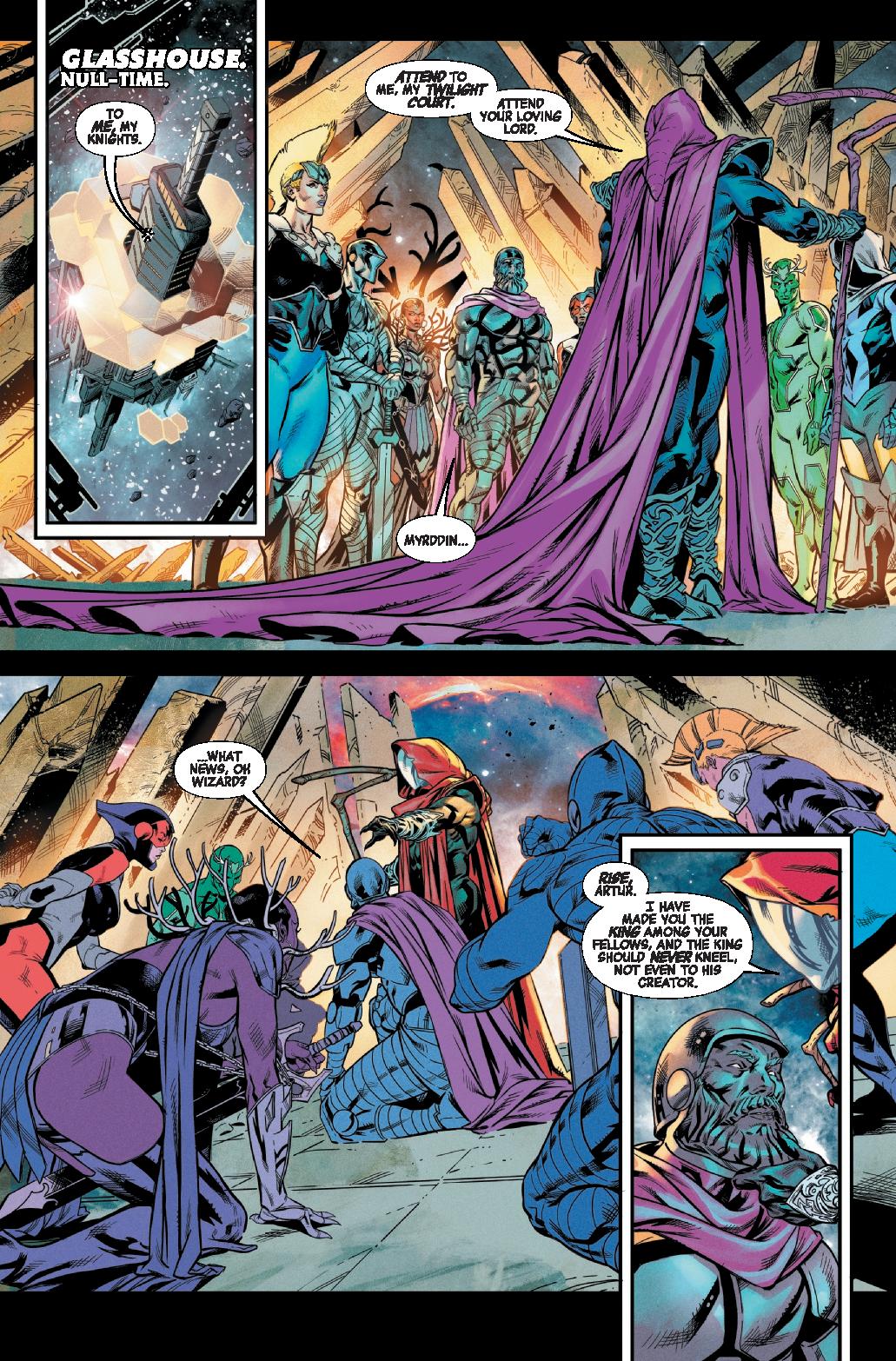 Solide bien que bavard. Jed MacKay fait un numéro d’exposition pour livrer des indices sur sa saga principale et la relancer sur le Missing Moment. Vision ayant craqué les données de Kang, il va avec les Avengers voir Reed Richards. Ils expliquent que le Missing Moment correspond au Graal et à un creux dans l’univers, un moyen de le défaire pour en recréer un. Et cela vient de Reed, qui a inconsciemment prévu cela en recréant l’univers après Secret Wars pour avoir toujours quelque chose de mystérieux à découvrir. Mais Myrddin en a assez de courir après le Graal et il a fait détruire le casino du Grand Maître pour provoquer un trouble dans la Réalité et avancer vers le creux (car les moments marquants listés par Kang sont sautés par cette triche). Les Avengers et Reed vont s’allier, alors que Myrddin explique à ses chevaliers les avoir créés sur le modèle des Avengers pour avancer vers le Graal, mais ils échouent trop souvent. Il les donne au Grand Maître en compensation de son casino, qui les tue et Myrddin prépare la suite…