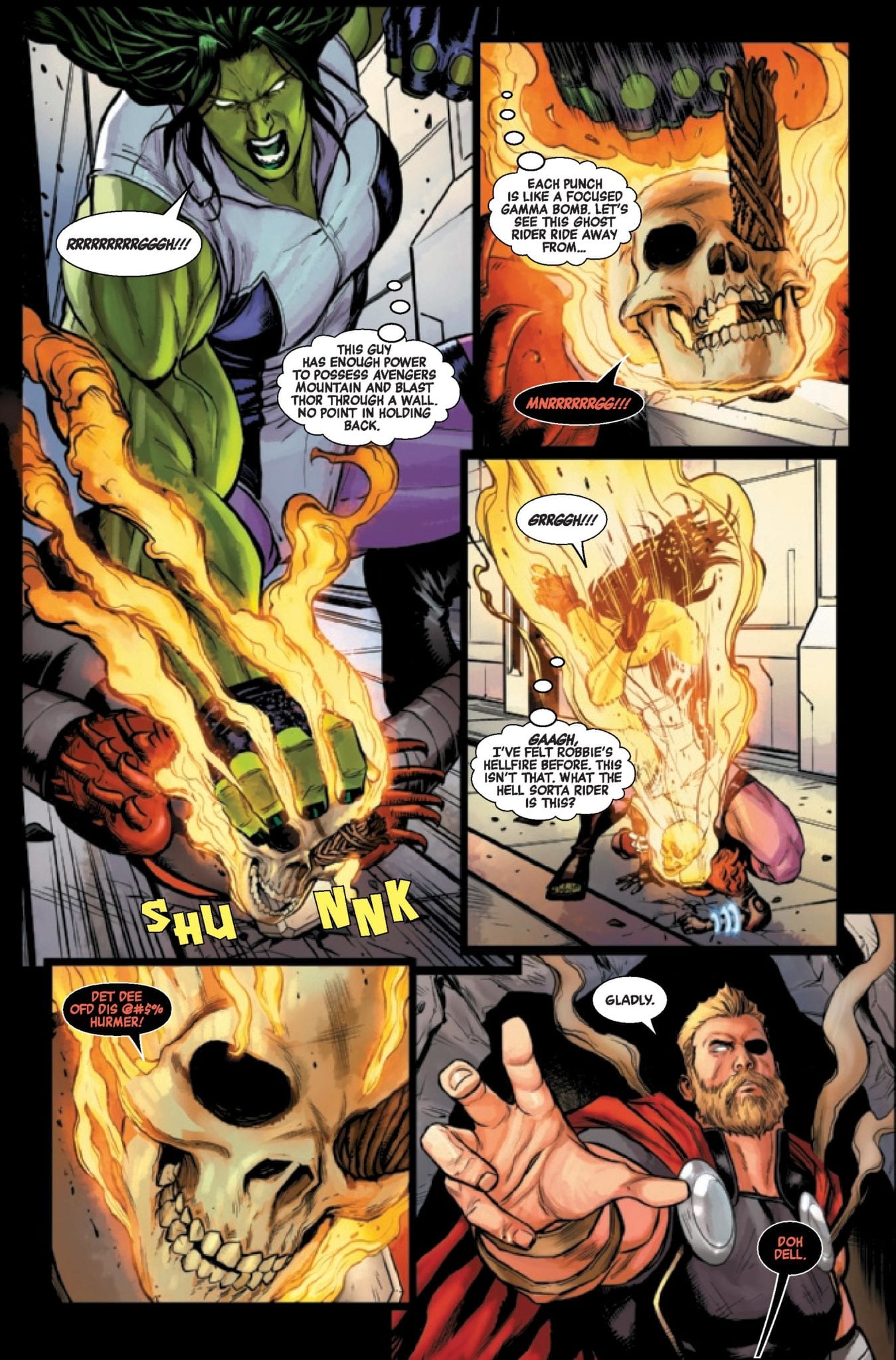 Robbie doute de lui, perd le contrôle de sa voiture, et décide de s’en débarrasser ; ça se passe mal. Au point que son frère est mis en danger. C’est suffisant pour demander de l’aide aux Avengers, qui convoquent Daimon Hellstrom pour un exorcisme, sous les commentaires acerbes de Blade. Ca ne se passe évidemment pas bien, et Robbie se retrouve dans le bouchon infernal, cette fameuse autoroute remplie de voitures… avec Johnny Blaze qui vient le voir ! Oh, et pendant ce temps-là, Okoye mène Thor et Stark dans une caverne où ils trouvent un casque métallique ressemblant à celui de Iron Man, avec un crâne dedans… datant de la Préhistoire !
