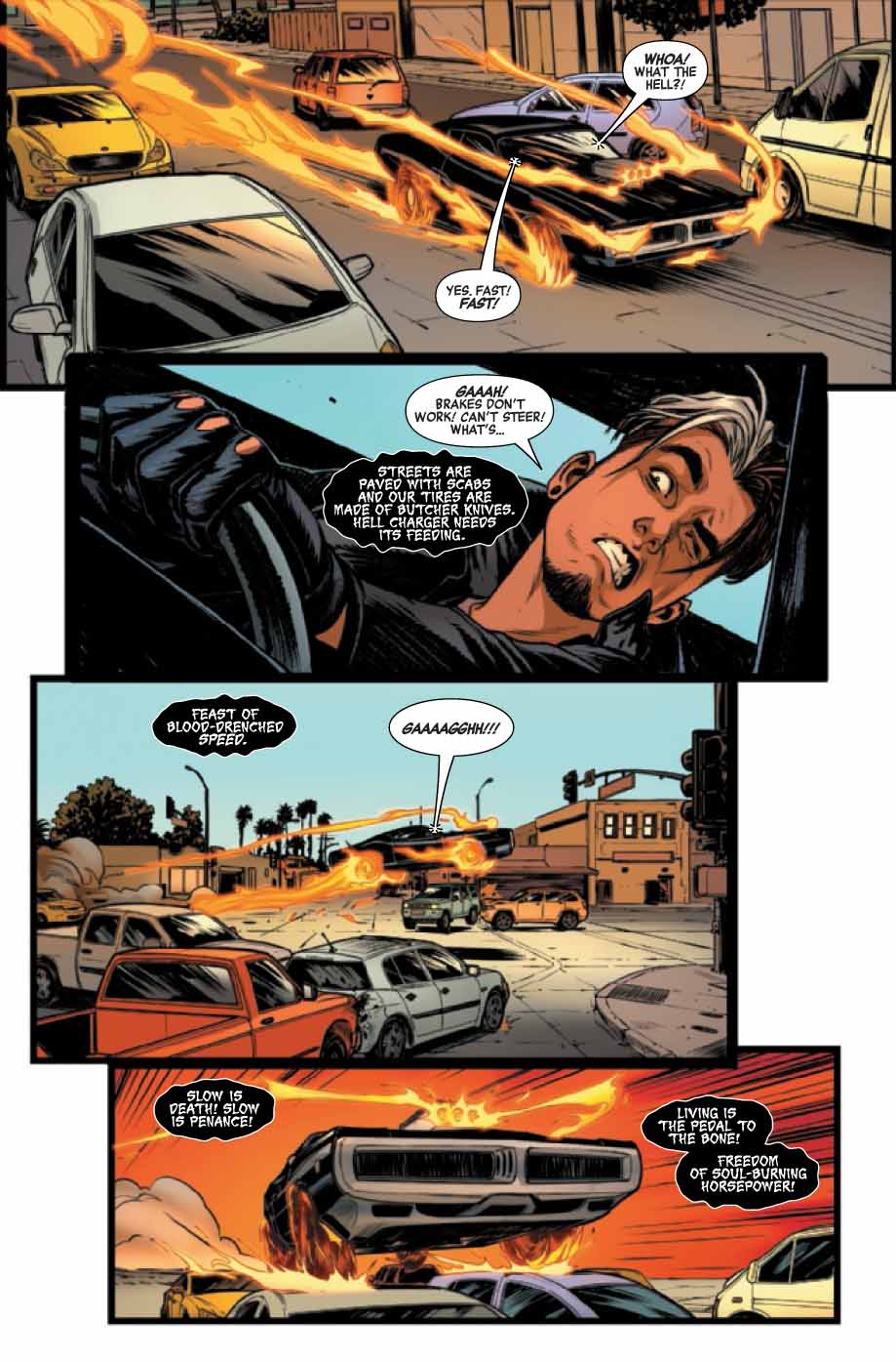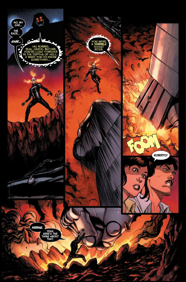 Robbie Reyes a été aspiré en Enfer lors d’un exorcisme à Avengers Mountain. Johnny Blaze, nouveau Roi infernal, lui lance un défi, une « Rider Race » afin de voler ses pouvoirs ; car il en a besoin pour dominer l’Enfer. Robbie ne cède que quand Johnny menace son frère, et Johnny triche pour essayer de gagner. En parallèle, les Avengers luttent contre une « créature » lâchée sur Avengers Mountain par Blaze ; si puissante qu’elle « anime » le Céleste mort. Il s’agit en fait de Cosmic Ghost Rider, envoyé ici pour tuer les Avengers !