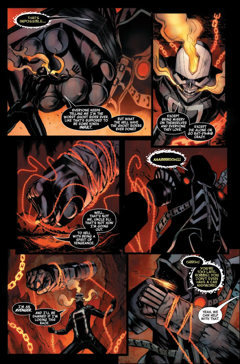 Jason Aaron continue sa saga en enfer, divisant l’action entre Avengers Mountain (où l’équipe affronte Cosmic Ghost Rider) et l’enfer (où Robbie fait une course avec Johnny Blaze, pour « tout » le pouvoir de Ghost Rider). Et ça ne m’a vraiment pas plu.