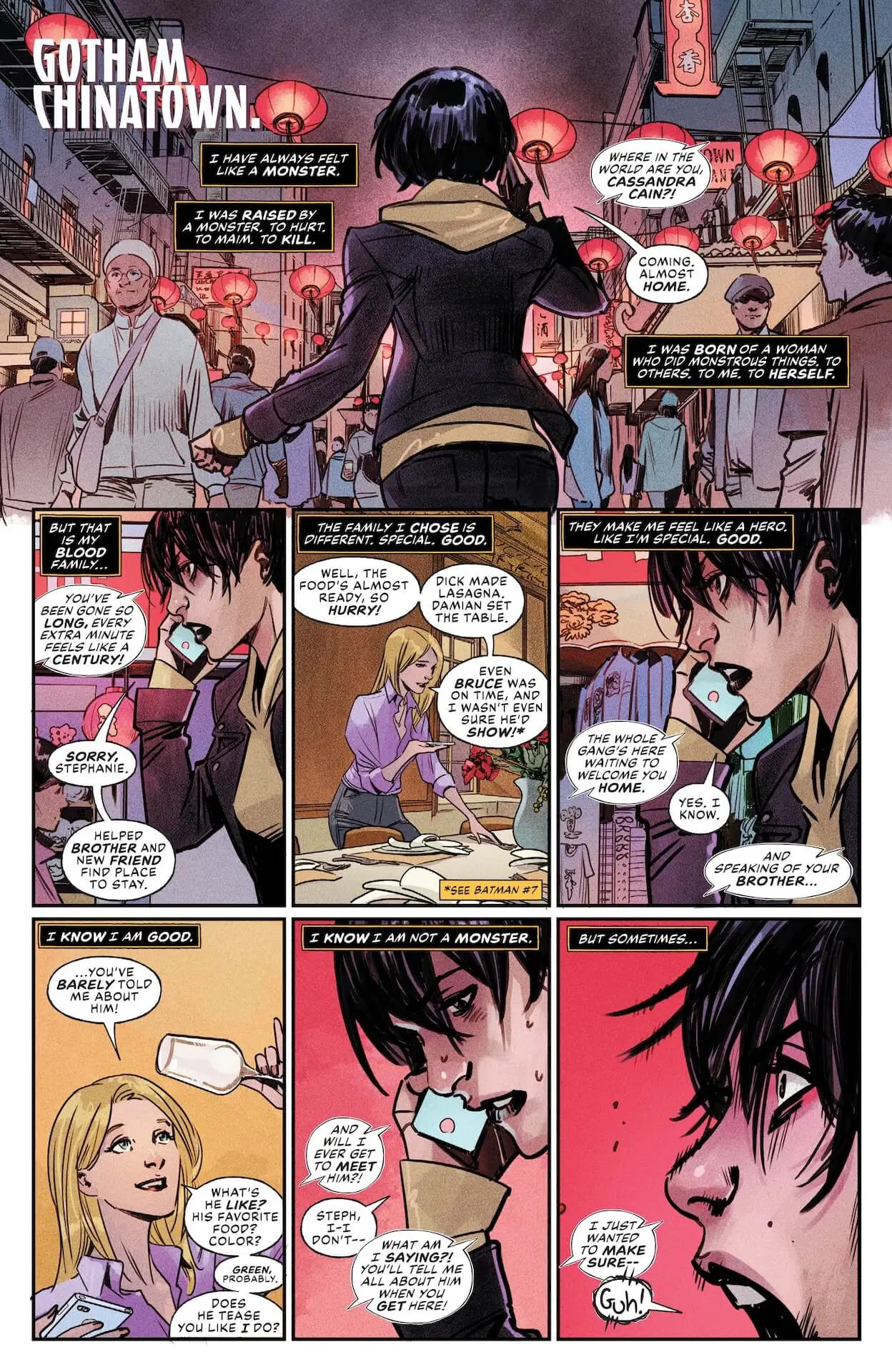 Ça se reprend. Tate Brombal continue sa série et ses sagas, mais se recentre à Gotham où Cassandra doit retrouver la Batfamily pour un dîner tous ensemble alors que son frère papote de solitude et d’abandon avec Jaya. Cassie vient leur demander de l’aide car elle est sous pulsion de The Blood of Wu, le pouvoir du sang de sa famille qu’elle ne contrôle pas. The Bloodmaster, membre de la famille qui gère ça, est en ville et le trio le cherche, mais quelqu’un l’abat. Ça se bagarre brutalement, le frère est blessé mais Cassie découvre que la mort du Bloodmaster crée un portail vers le Spirit World.