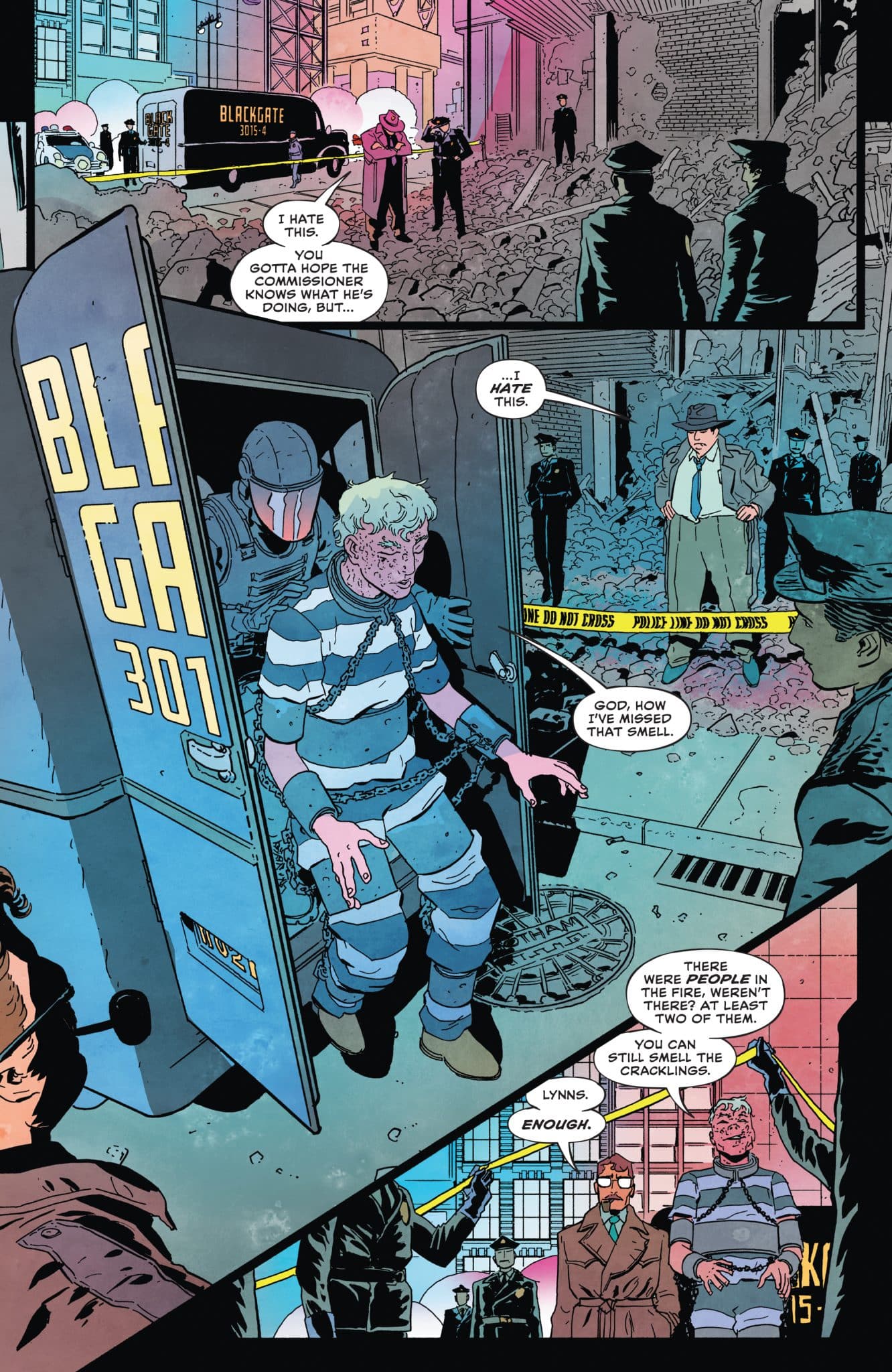 Apparemment, la série se situe aux environs de l’an 3. 12 numéros, 4 meurtres , un Batman qui bosse plus avec sa bagnole, ses poings et les Gothamites qui sont plus de la moitié à penser qu’il n’est qu’une légende urbaine.