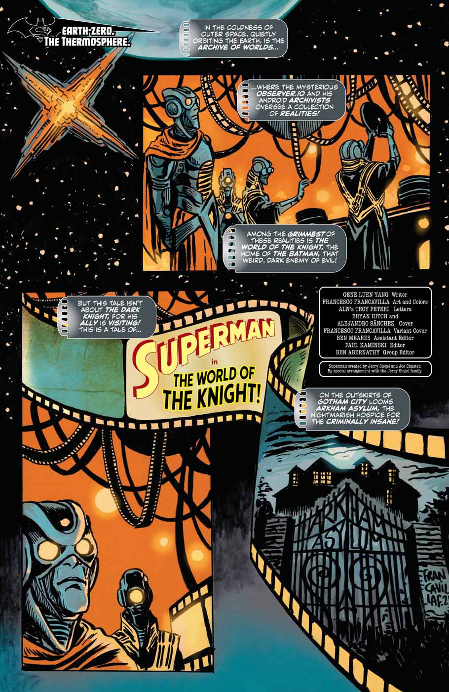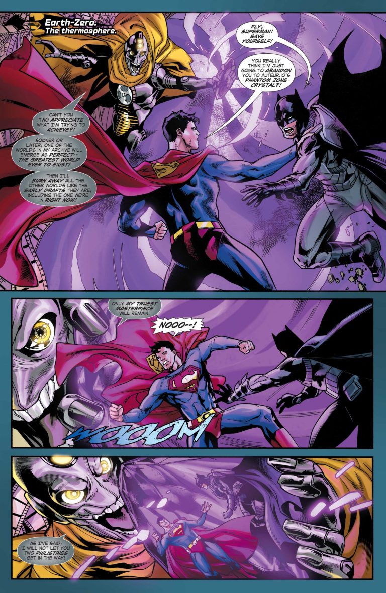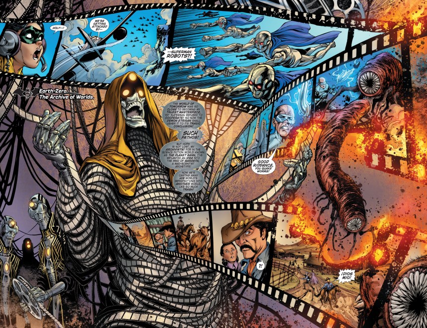 Gene Luen Yang ne perd pas de temps : il va vite, il résout des mystères et en dit plus sur Auteur.io, l’étonnant adversaire des vrais Batman et Superman, qui découvrent un satellite avec plein de vieilles bandes de film qui concernent des mondes parallèles. On y voit d’ailleurs la rencontre entre des versions « originales » de Batman et Superman, qui croisent aussi d’autres versions d’eux-mêmes, comme un Bruce Wayne maniéré élevé par une Martha Wayne survivante et brutale.