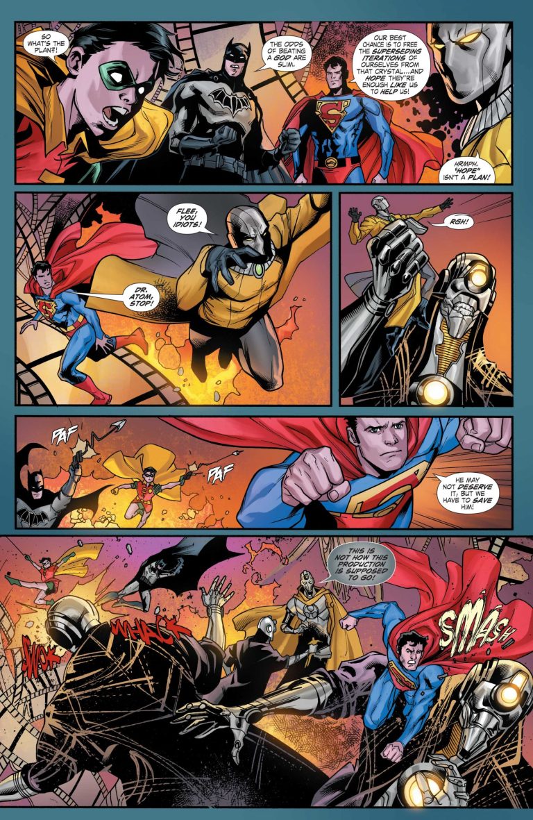 Le dessinateur parvient à donner une aura, une puissance, une fougue, un charme à l’intrigue et ça fonctionne très bien. Il fait passer le script trop classique de Gene Luen Yang, qui continue d’envoyer les versions dérivées de Batman, Robin, Superman, Alanna et El Diablo dans plusieurs mondes. Là, ils reviennent sur celui du Superman du Golden Age, « The World of Tomorrow », car Auteur.io y envoie son « destructeur de mondes », un Etrigan issu d’un monde démoniaque.