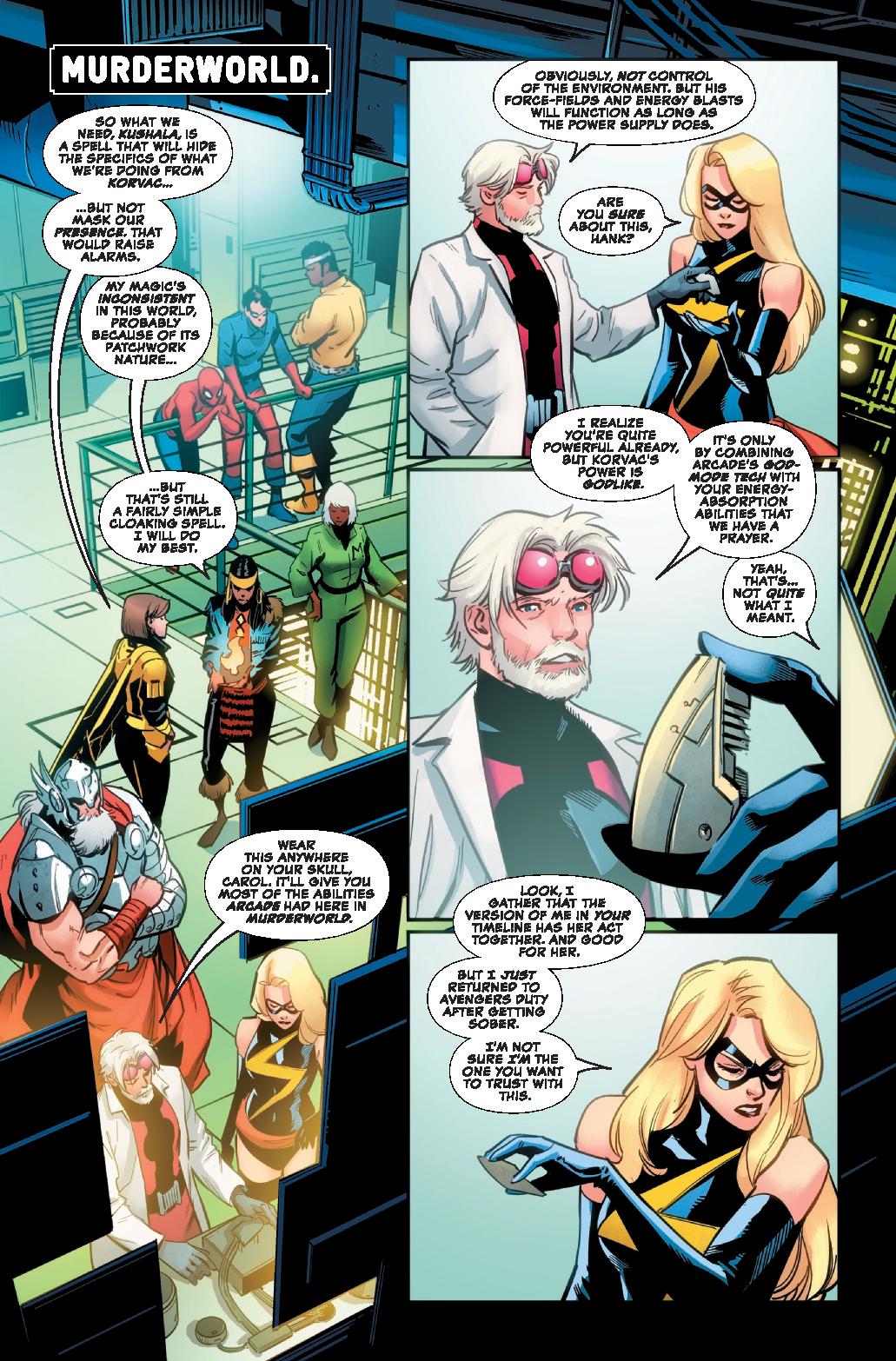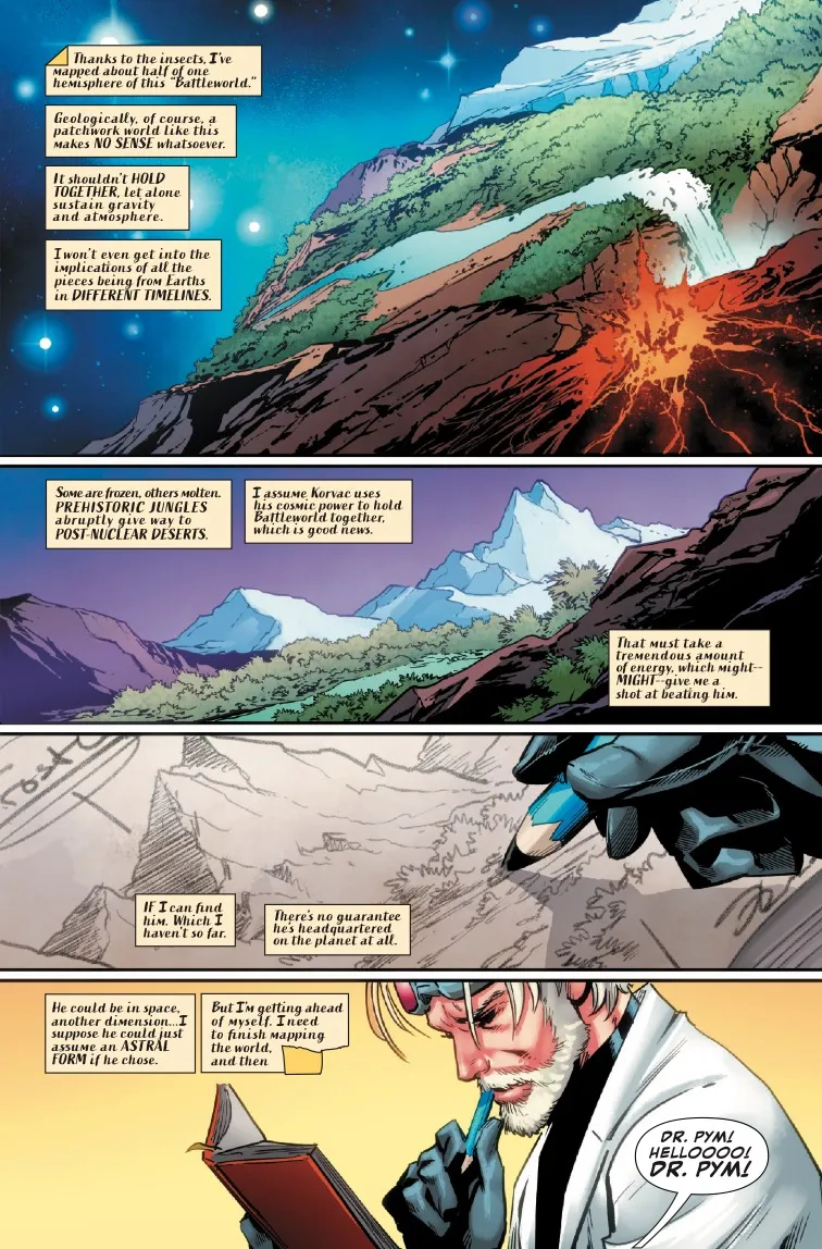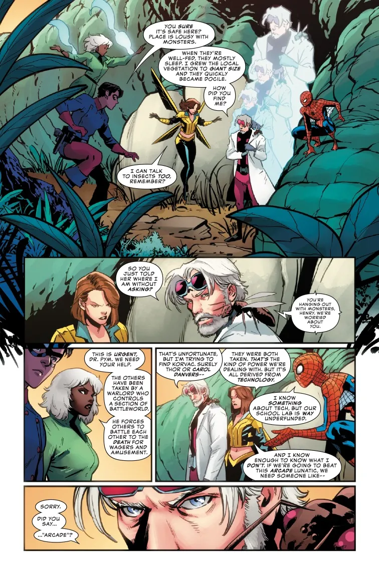 Très bien. Christos Gage enchaîne très bien avec un épisode fluide, pertinent et efficace, en lui-même et en continuité. Hank Pym tente de cartographier en solo Battleworld mais ses alliés l’alertent car plusieurs d’entre eux ont été pris par Arcade qui organise des combats forcés. Cela rappelle Avengers Arena à Hank, qui accepte d’aider et de briser Murder World qui ressemble à celui vu dans Arena et qu’il a étudié après coup. Ils libèrent les prisonniers puis Hank infecte Arcade avec des insectes mais le laisse vivre quand Arcade accepte de tout stopper. Pym accepte d’aider les autres à stopper Korvac, alors que celui-ci convainc le Starbrand du New Universe de l’aider.