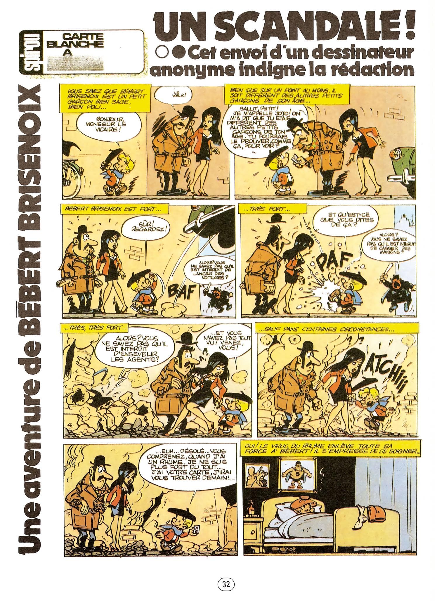 Le rythme est soutenu, les dialogues sont riches sans être bavards, les gags sont nombreux, la caractérisation des méchants est plutôt bien sentie. Le comique de répétition fonctionne, les situations saugrenues se succèdent, et les sbires du méchant vont de circonstances grotesques en occasions ratées. Benoît utilise ses pouvoirs toujours loin de son oncle, quand ce dernier est assommé par un gaz somnifère ou occupé par une fusillade. Pourtant, il passe son temps à tenter d’expliquer ses capacités surhumaines à son tonton, mais l’occasion ne se présente pas, jusqu’à même la dernière planche.