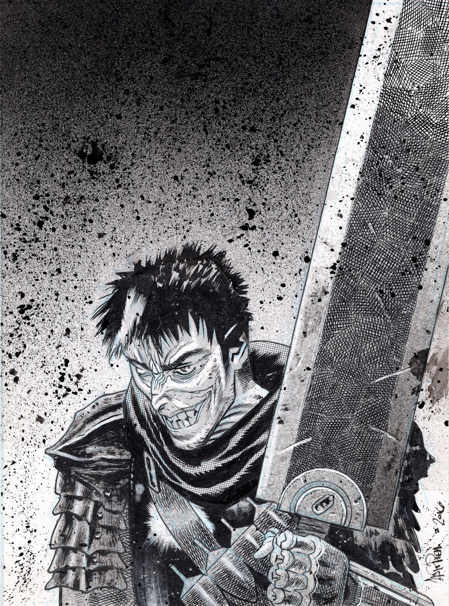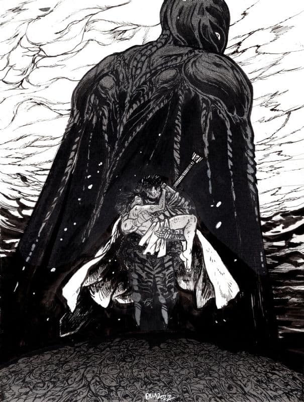 Guts, le guerrier noir, promène son imposante silhouette de routes en villages. Sur son passage, les cadavres s’amoncellent et il laisse derrière lui des torrents de sang. Le corps vêtu de noir, il porte sur son dos une épée aussi haute qu’un homme. Sur son cou, une marque mystérieuse le condamne à être poursuivi jour et nuit par des démons. Puck, l’elfe facétieux, croise un jour le chemin de cette machine à tuer. Quelles horreurs a-t-il pu connaître pour être animé d’une telle soif de vengeance ? Alors que le monde sombre inextricablement dans le chaos, Guts règle ses comptes avec les forces démoniaques qui resserrent leur emprise sur la destinée des hommes. Une époque s’achève.