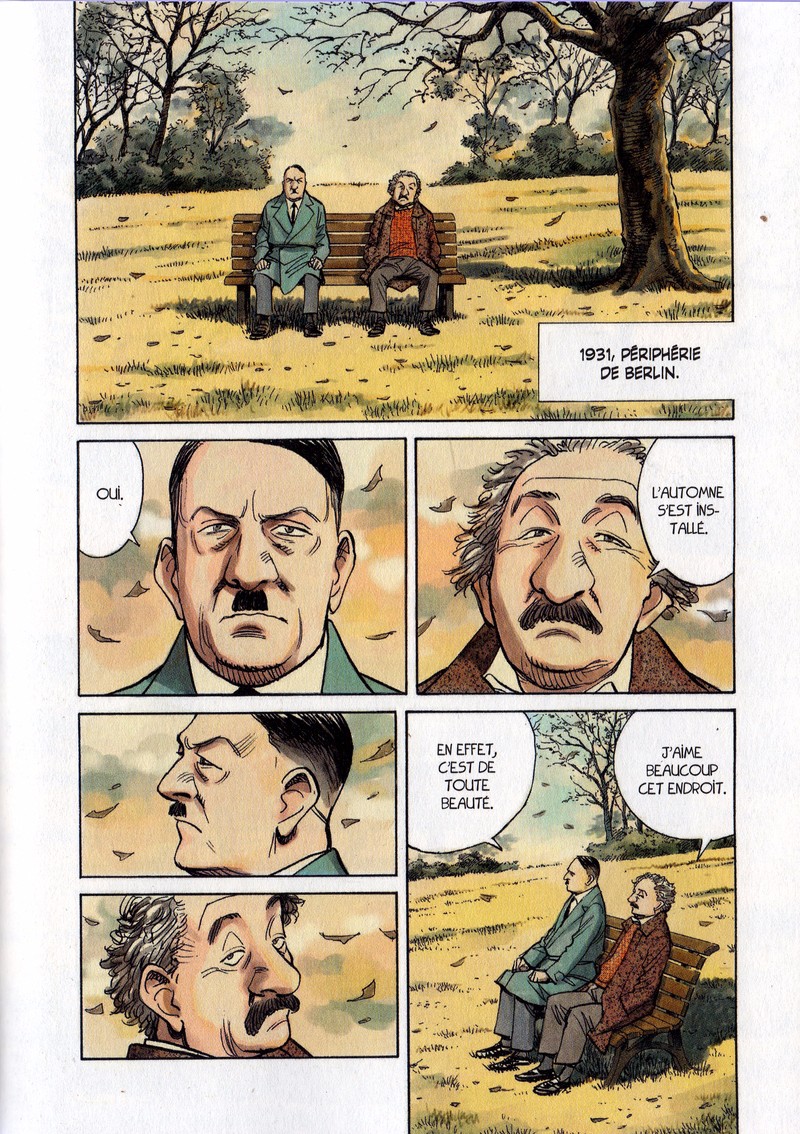 Et donc, ouais, l’ouverture de ce tome 13 : Albert, physicien génial, et Adolf, homme politique en proie au doute, se retrouvent sur un banc, dans l’Allemagne de 1931, et discutent. De la beauté de l’univers, de la structure de la nature… et des chauves-souris. Et c’est magistral. Quelle manière de reprendre contact avec la série.