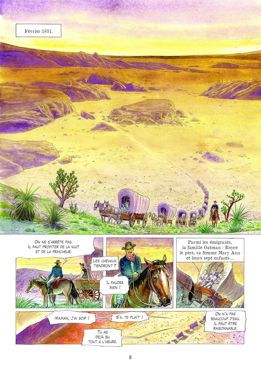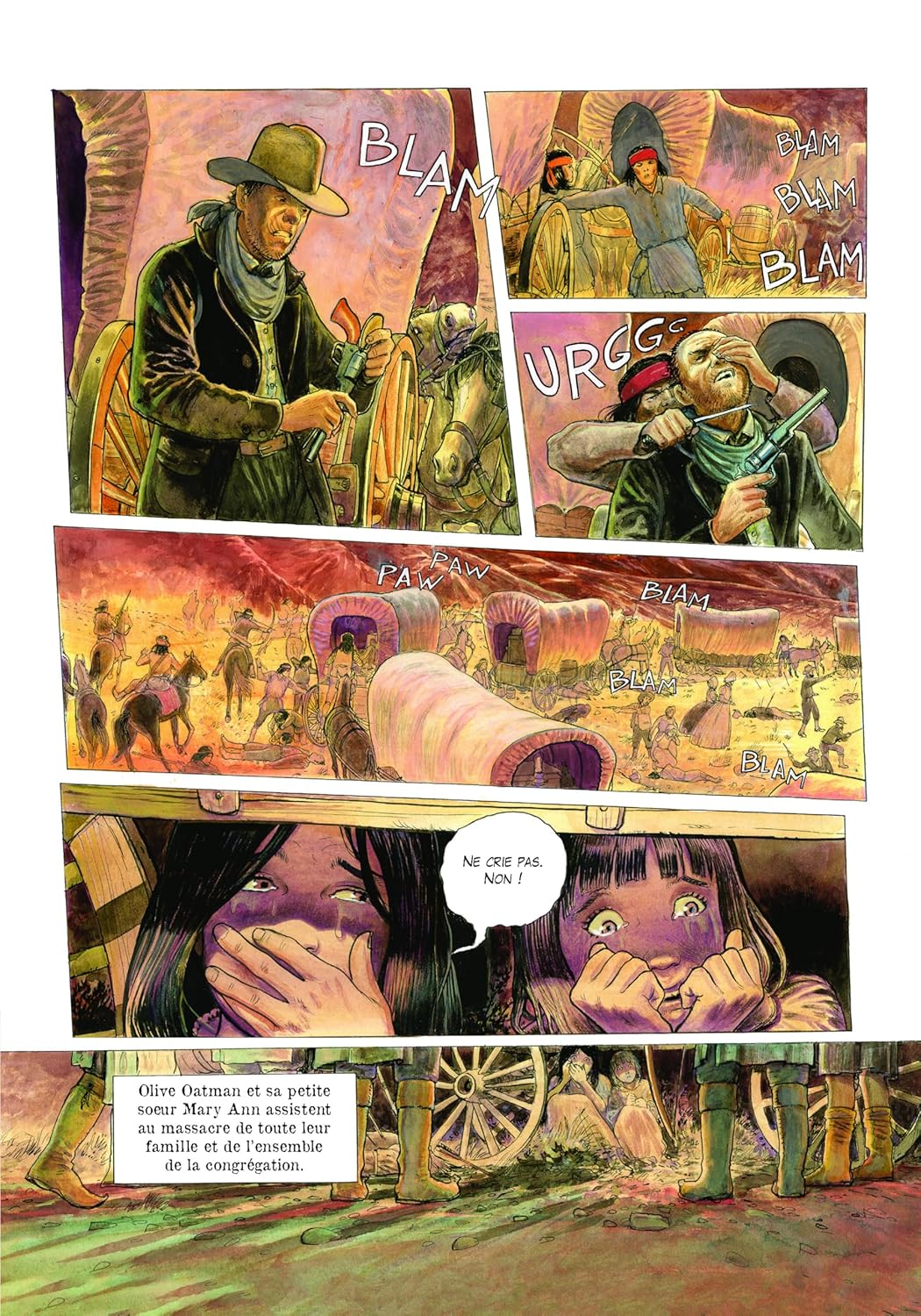 Pete, l’un de ces « rabatteurs », sait lire et écrire. La curiosité le pousse à ne pas détruire l’un des exemplaires et à en parcourir le récit. À travers sa lecture, nous découvrons la vie d’Olive Oatman, enlevée par des Amérindiens, intégrée à une tribu bienveillante, tatouée puis ramenée de force à la civilisation…