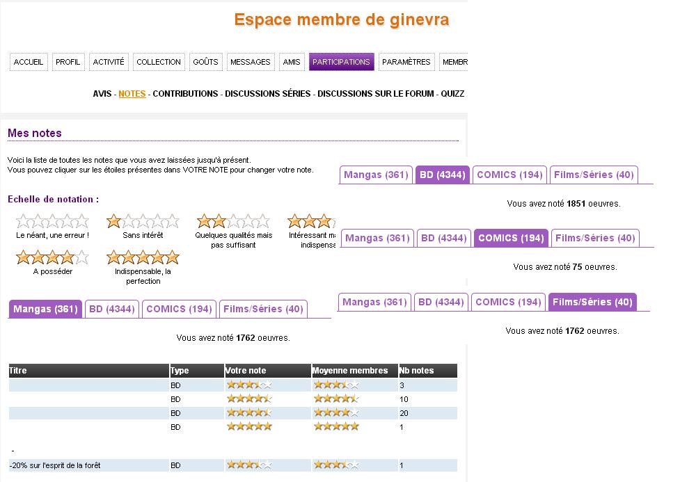 j’ai constaté en truc vraiment bizarre en regardant mes notes à partir de mon espace membre. Selon l’onglet j’ai des résultats différents. le seul qui marche bien est « comics » où n’apparaissent que des comics (75), pour « mangas » et « films » il y a un gros mélange mais essentiellement des BD et je suis censée avoir noté 1762 oeuvres, sur « BD » il y a aussi un gros mélange et j’aurais noté 1851 oeuvres… Cela en fait quand même 89 en plus!!