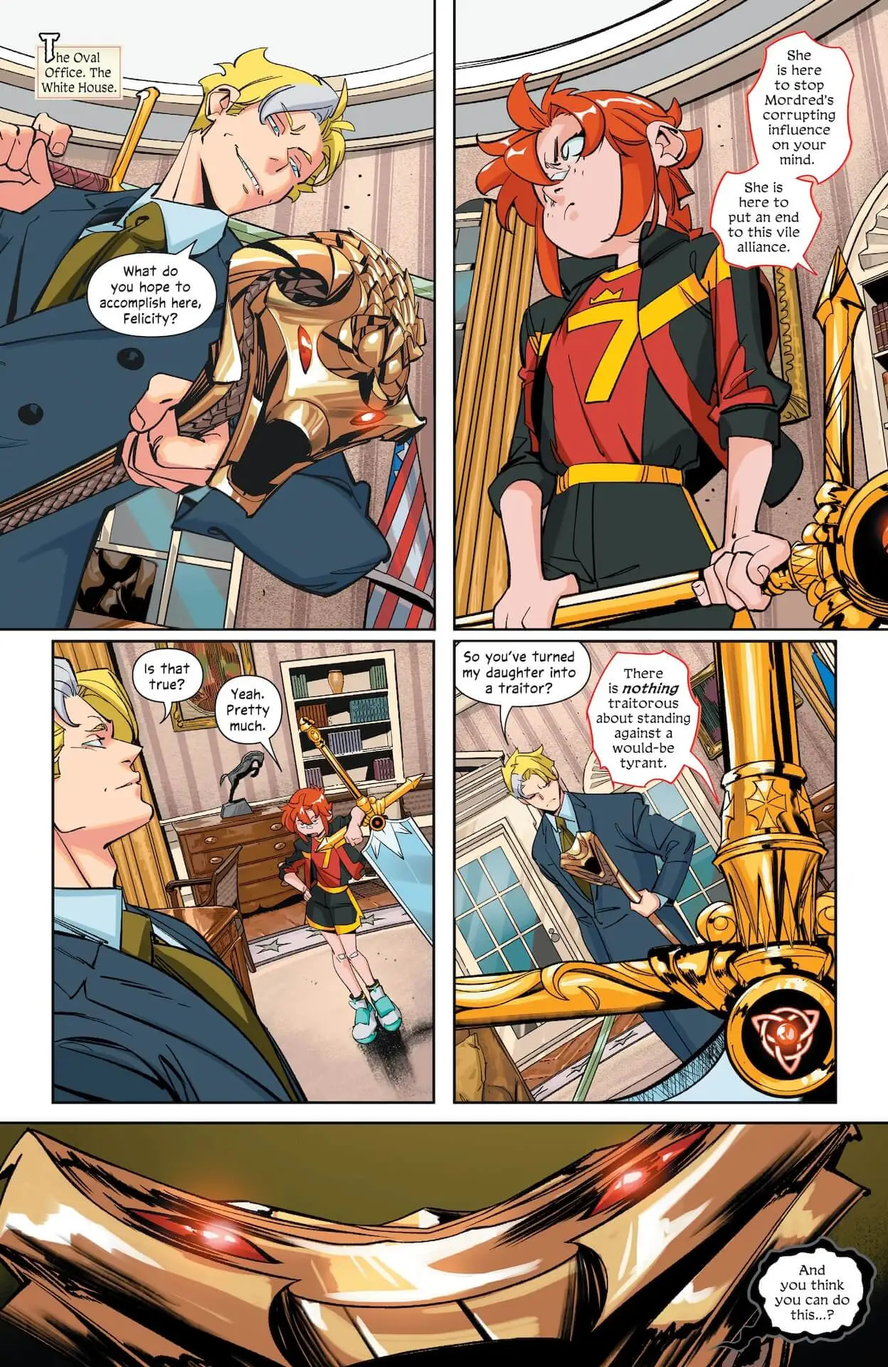 For the Children of the Round Table, the entire world has changed in just 24 hours. As if being chosen to wield legendary, talking weapons wasn’t enough, now they find themselves in the presence of Merlin the magician. With the kids still being hunted by agents of Mordred, there is only one safe place to hide and to train for the battles to come. A place hidden from our world. The novice knights must journey through a mystical veil…to Camelot.