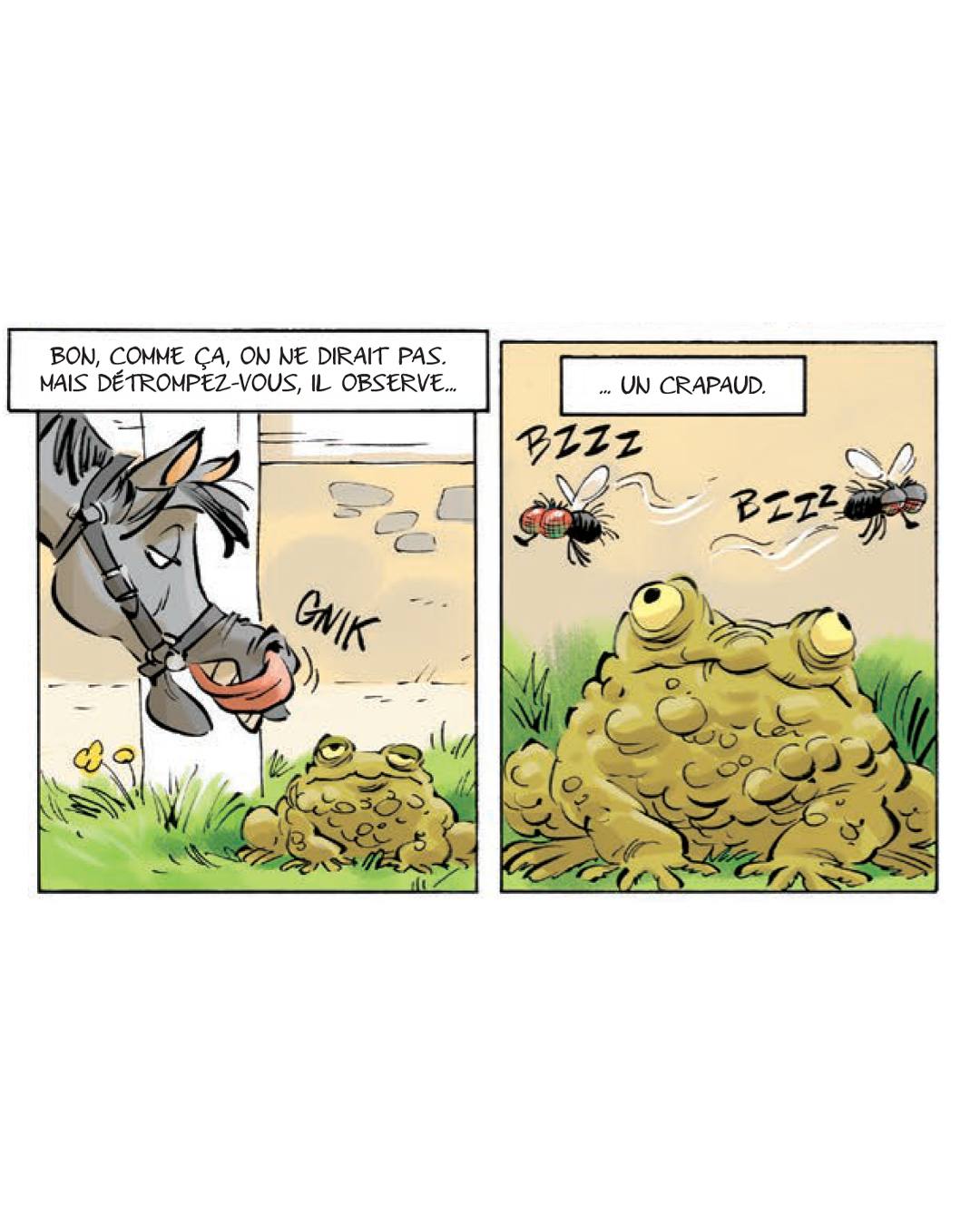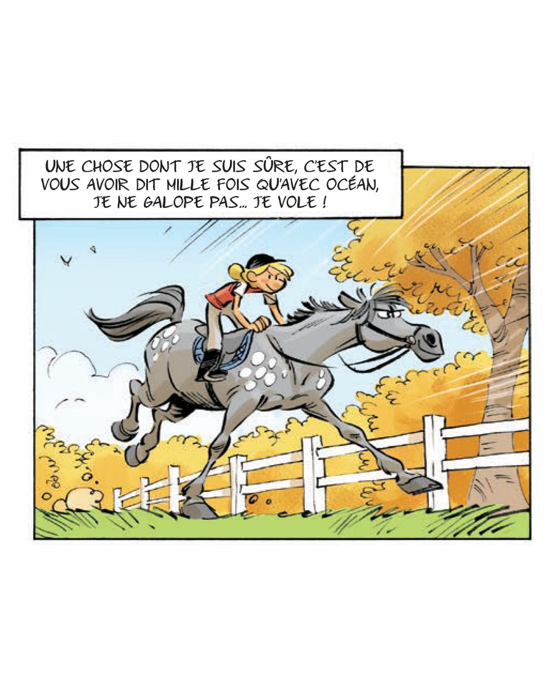 Camomille a 10 ans. Et elle a une passion : les chevaux. Mais ça n’a pas toujours été le cas. Quand elle était petite et qu’elle passait devant le club équestre des Quatre-Fers, elle se pinçait le nez. Et puis, elle a fait la connaissance d’un superbe cheval, Océan. Depuis, ils sont devenus inséparables. Ensemble, ils galopent cheveux et crinière au vent.