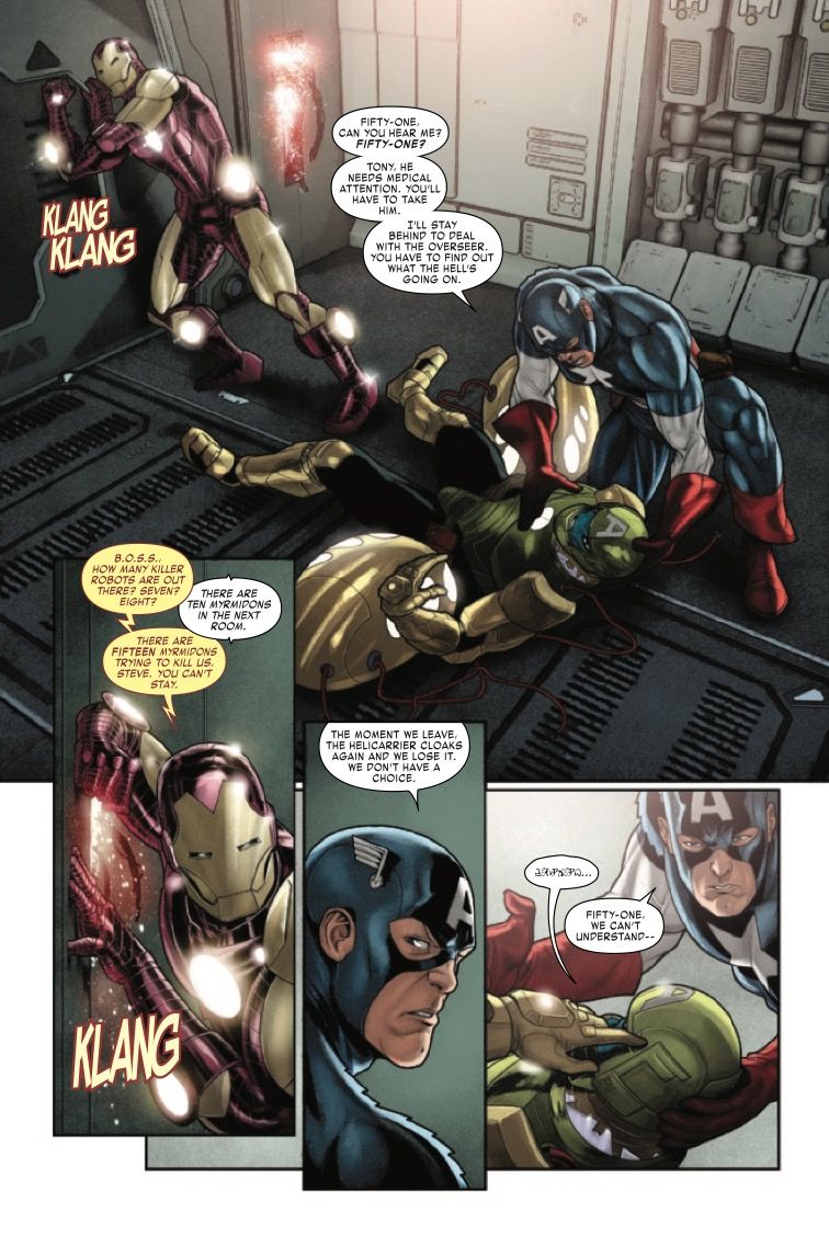 Derek Landy s’approche de la fin en livrant en fait les dessous de tout ça, avec des explications pour Iron Man et Cap’, chacun dans son coin, chacun avec son interlocuteur. Steve est forcé de mettre l’armure de Captain Hydra pour éviter les trop gros coups des Myrmidons, mandatés par l’I.A. ennemie, alors que Tony confronte un Sénateur, allié à Veronica.